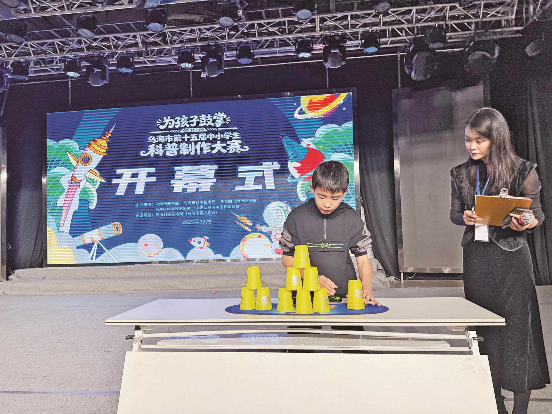 12月6日,“为孩子鼓掌”乌海市第十五届中小学生科普制作大赛开赛,来自全市22所中小学校和乌海市职业技术学校的730名学生参加了万能机床、航模、智力飞叠杯、机器人编程等7个项目的比赛。图为学生参加智力飞叠杯比赛。 (段维娜 摄)