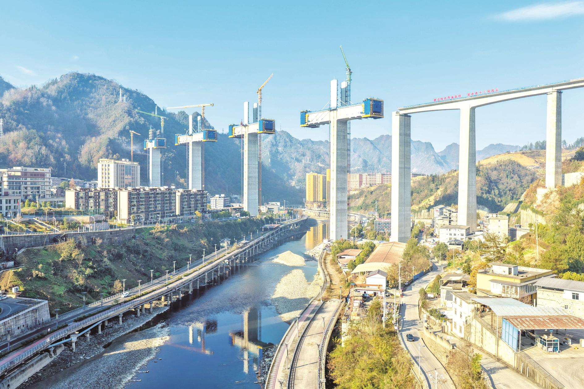 这是12月7日拍摄的西渝高铁任河特大桥建设现场(无人机照片)。当日,由中铁十二局承建的西渝高铁城口任河特大桥塔柱施工任务全部完成,全桥施工进度完成近七成,为西渝高铁全线按期贯通奠定了基础。城口任河特大桥位于重庆市城口县境内,为西渝高铁康渝段重难点工程,全长1180.52米。西渝高铁是我国“八纵八横”高铁网北京至昆明的京昆通道和包头、银川至海口的包(银)海通道的重要组成部分,线路全长739公里,设计时速350公里。 新华社记者 唐奕 摄