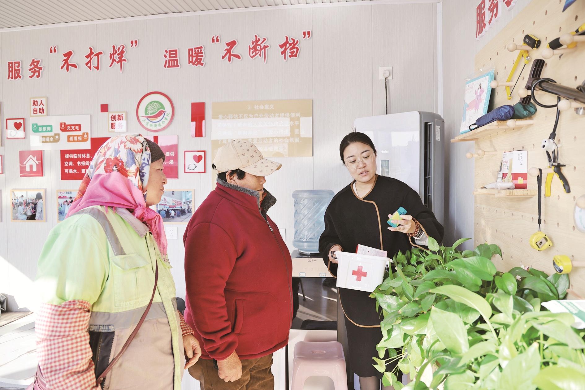 乌达区三道坎街道富强社区“暖心里”服务驿站紧贴居民需求配备急救药箱、工具箱、饮用水、充电宝、共享雨具等便民用品。图为,社区工作人员向居民讲解医疗包使用方法。
