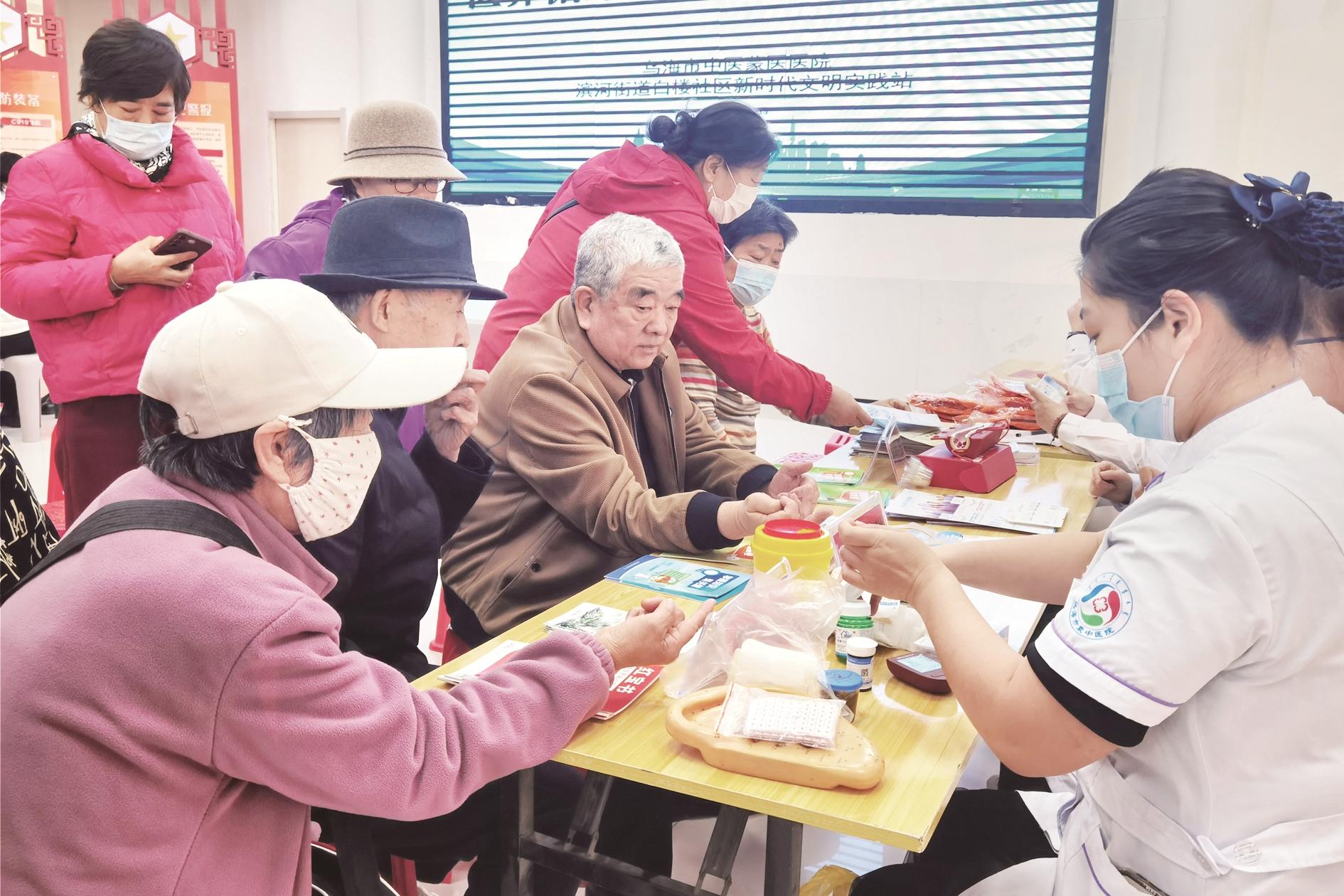 近日,海勃湾区滨河街道白楼社区新时代文明实践站联合市中医蒙医医院开展义诊进社区活动。活动中,医务人员为辖区居民测血糖、量血压,并开展健康宣教,提出合理的治疗建议。