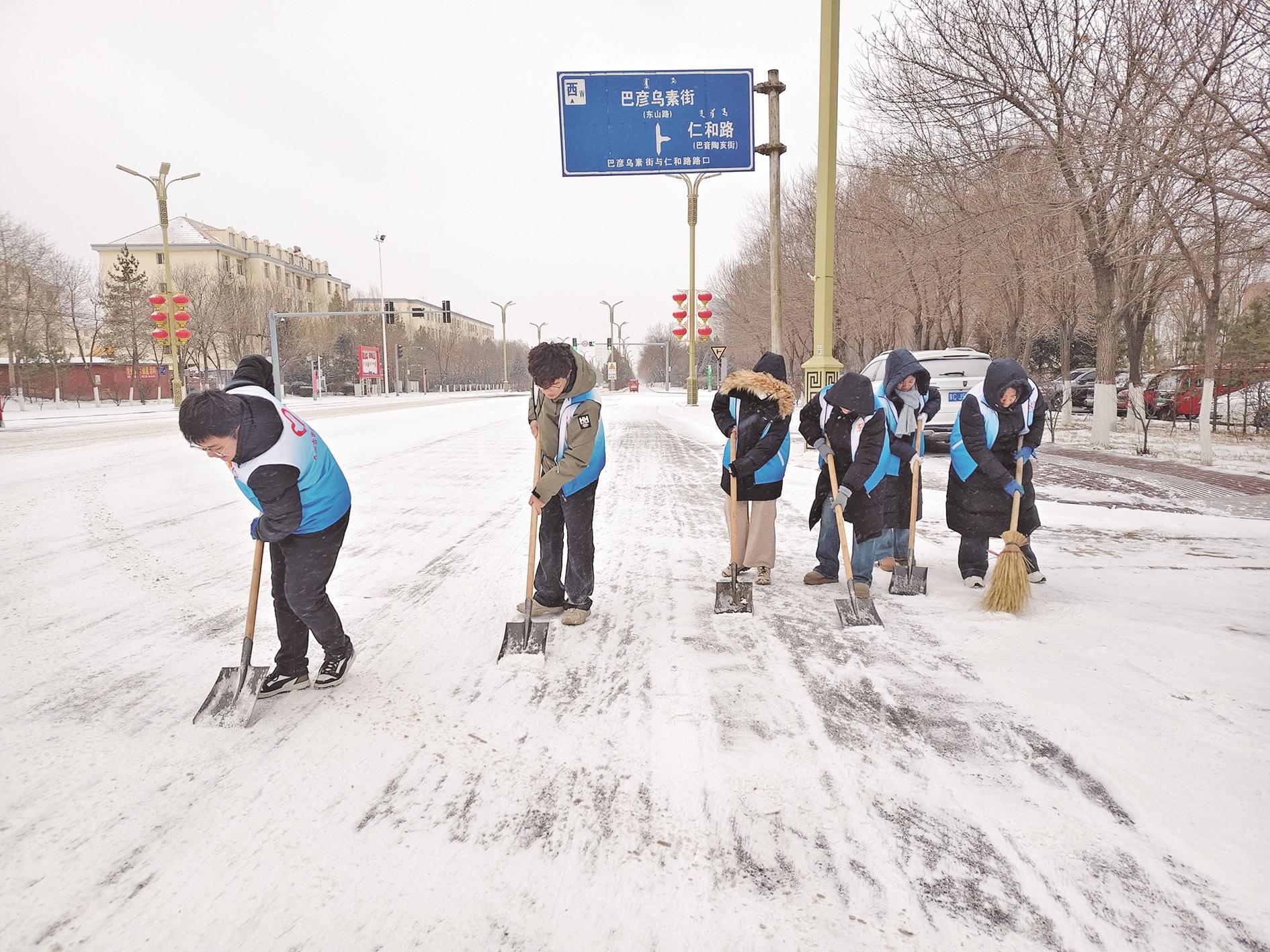 12月12日,普降瑞雪。银装素裹的美景令人惊喜,但同时也给居民出行带来了诸多不便。海南区团委以雪为令,迅速行动,组织青年志愿者全面开展扫雪除冰志愿服务活动。 (段维娜 摄)