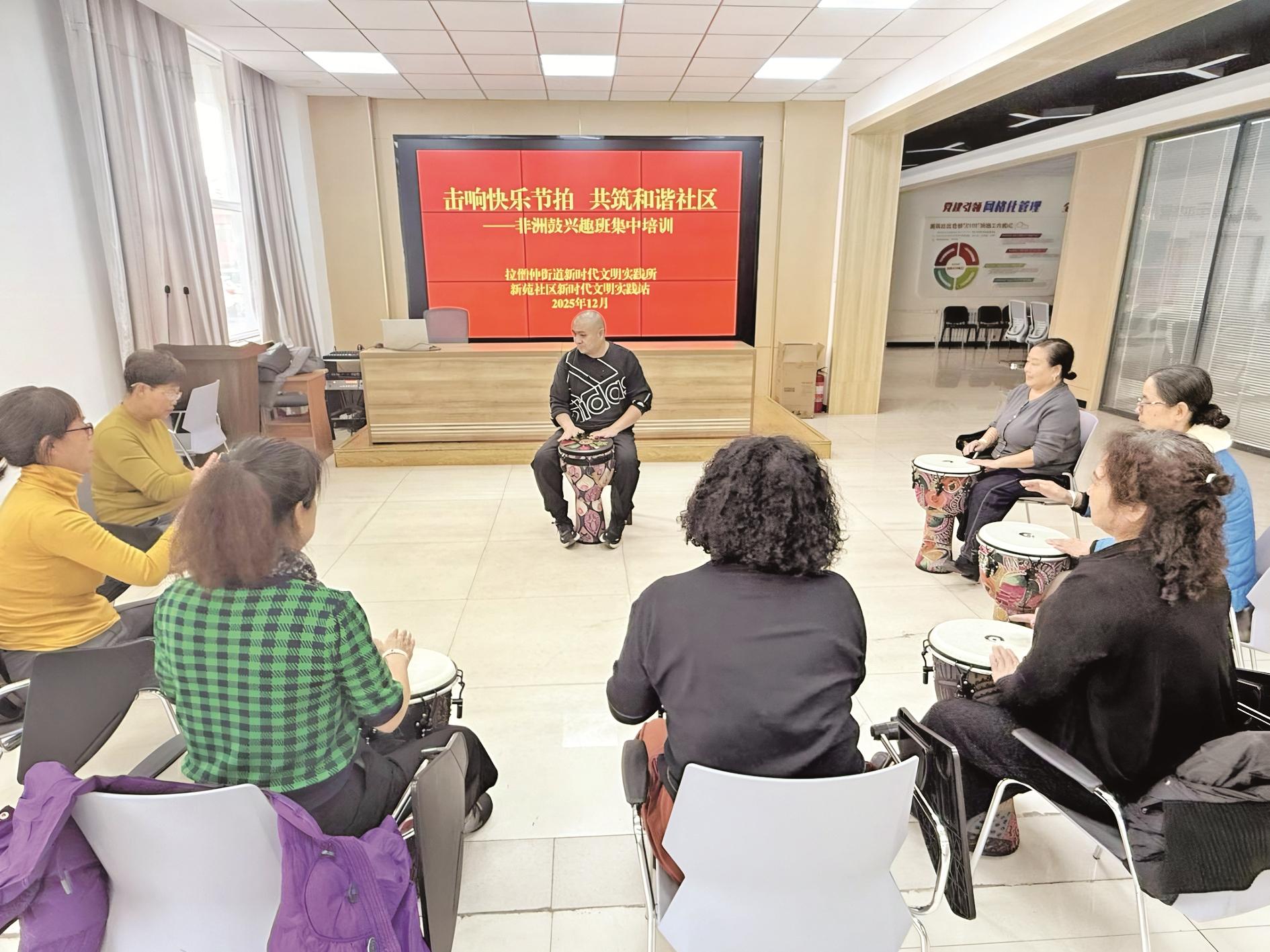 12月15日,海南区拉僧仲新苑社区新时代文明实践站开展了非洲鼓学习活动,吸引了居民踊跃参与。活动现场,非洲鼓老师为大家介绍了鼓的构造、握鼓姿势,简单的节奏型打法,并耐心细致地讲解示范。此次活动不仅为居民提供了学习交流的平台,更以文化为纽带,拉近了邻里距离。