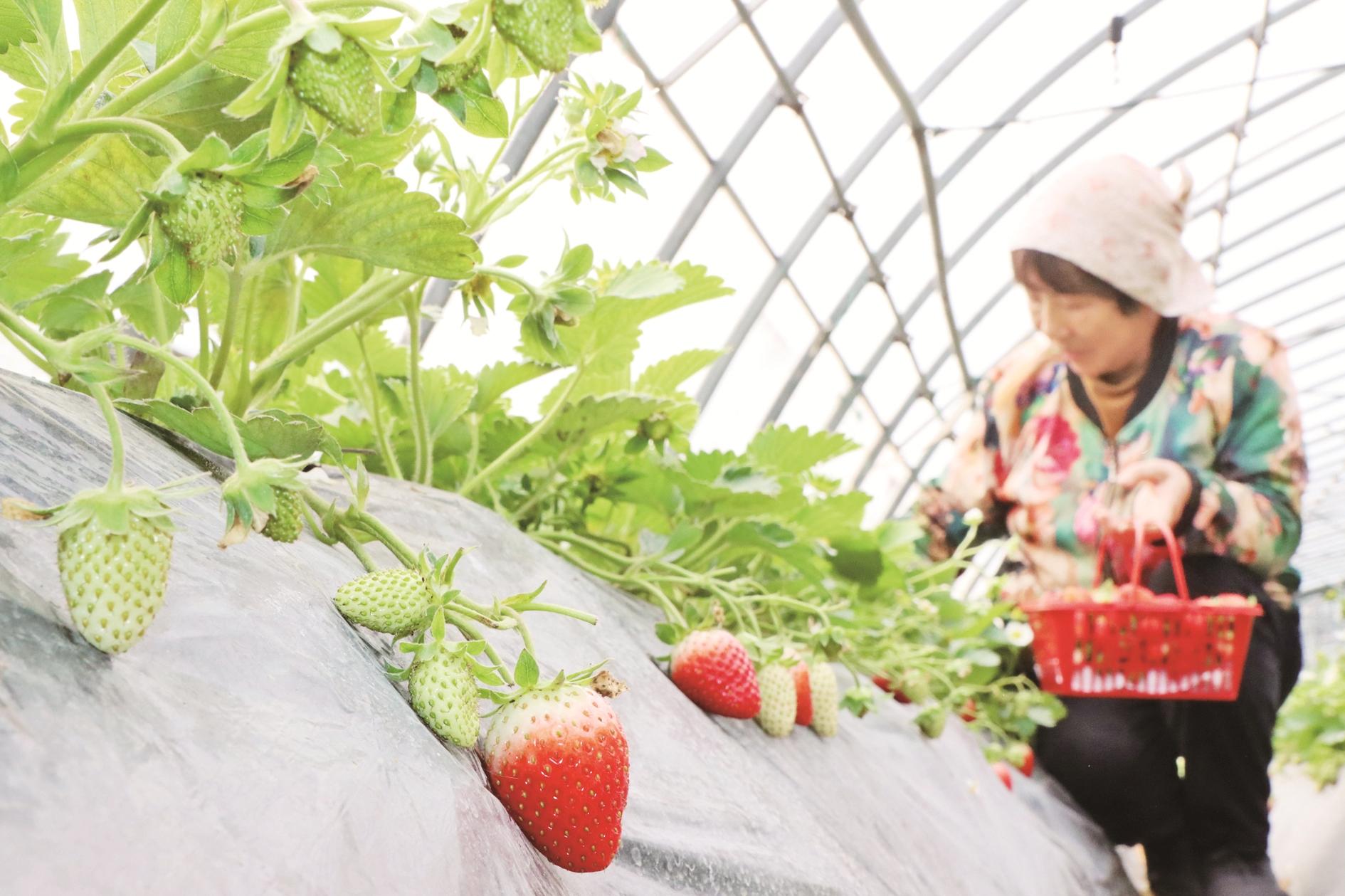 12月16日,农民在山东省滨州市博兴县湖滨镇柳童村大棚里采摘草莓。各地农民抢抓农时,开展田间管理、采收及农产品加工,为稳产保供和来年丰收打下坚实基础。 新华社发(陈彬 摄)