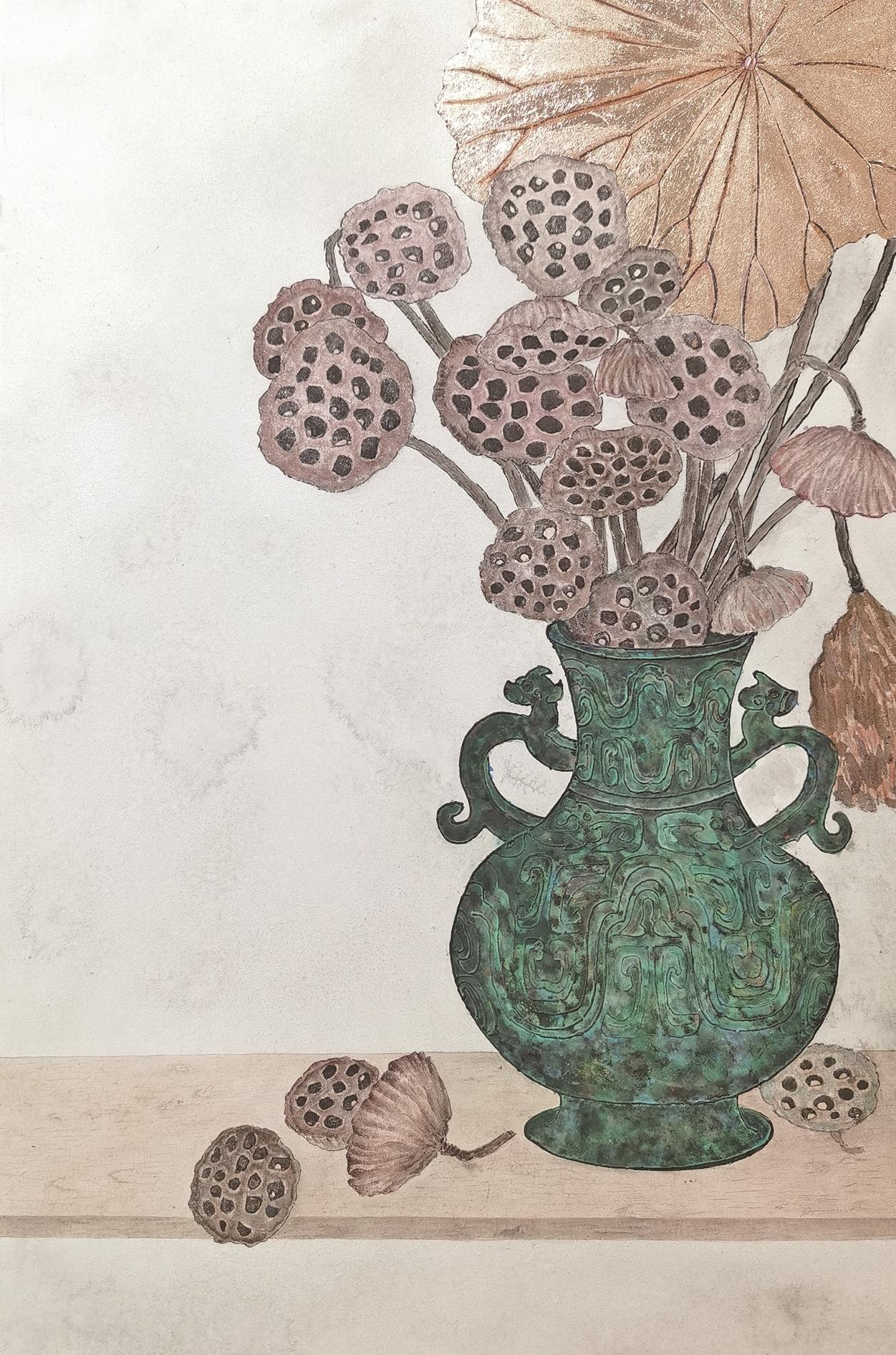 国画研修班的课程涉及多个科目,从写生、色彩到画种的变化,壁画、岩彩画、绢画、重彩、泼彩、青铜器等多个种类,而刘鑫最爱以金为墨、以火为笔的烧箔画。刘鑫创作的烧箔画《荷花》堪称一场金属与匠心的对话。制作时,需甄选纯度上乘的金箔。创作之初,需先在素胚上勾勒荷花的疏影横斜,而后屏息凝神,将金箔逐片精准贴合于线条之间——花瓣的柔润弧度、荷叶的舒展肌理,皆需通过金箔的叠加与拼接细腻呈现。这一步不仅考验手法的轻盈,更需把控金箔的张力,避免出现褶皱或破损,让每一寸金面都平整如镜,倒映出荷花的清雅风骨。