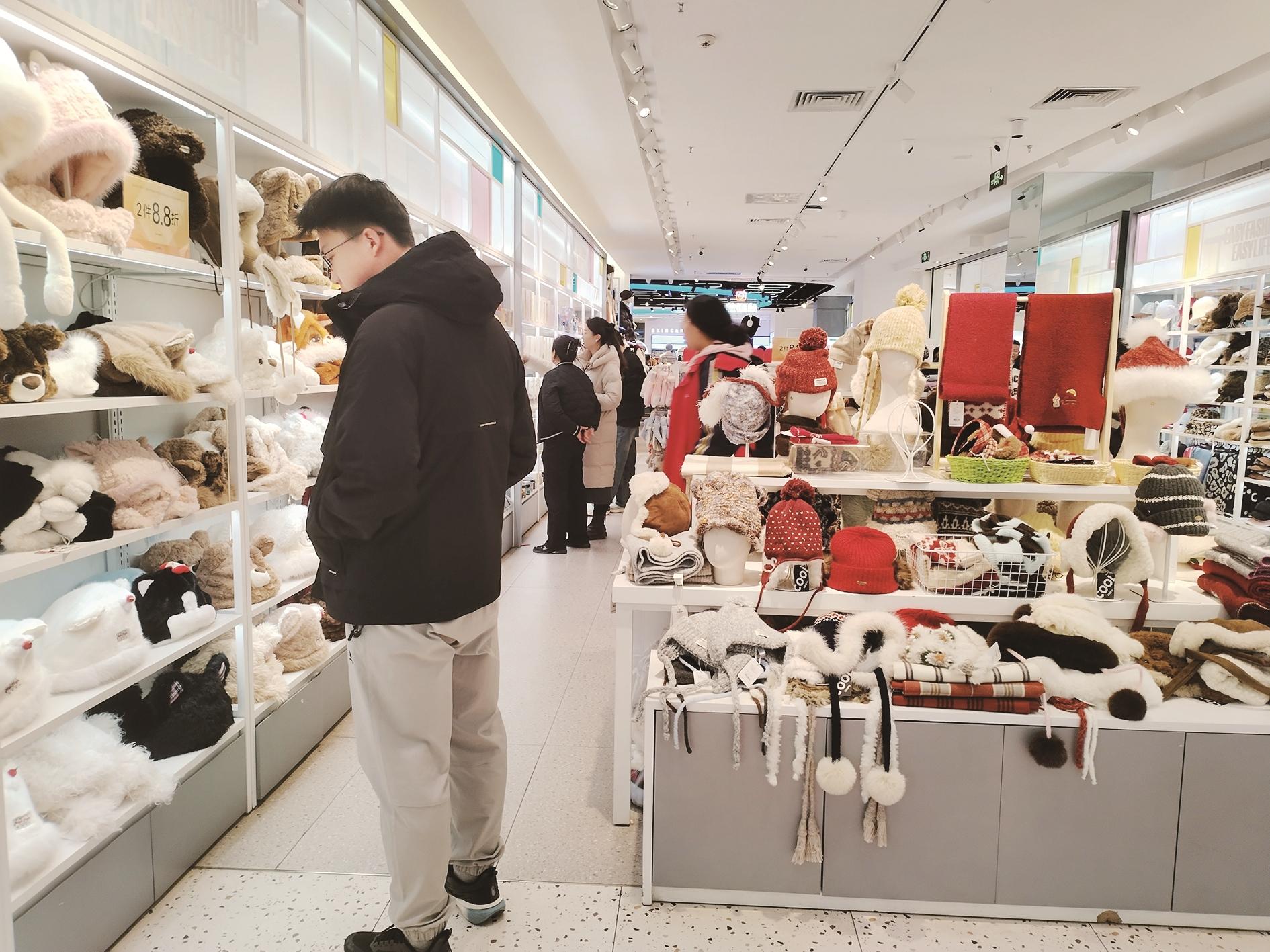 随着气温走低,市民对保暖用品的需求逐渐增多,棉帽、羽绒服和取暖器等商品销量大幅攀升。图为近日,市民在我市商场选购保暖服饰。 (肖传军 摄)