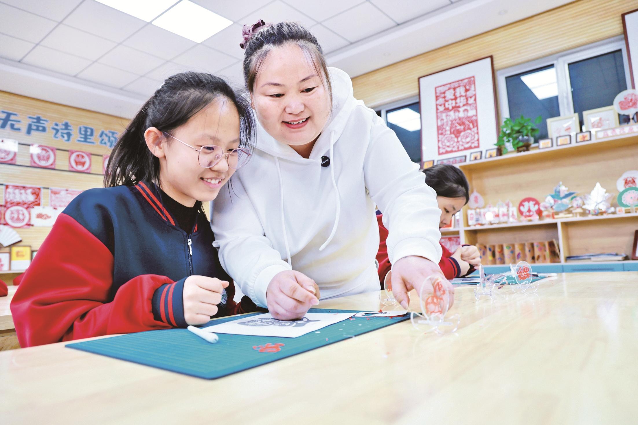 近年来,我市教育部门充分利用文化资源,将中华优秀传统文化融入学校教育,通过强化师资队伍建设,在丰富校园文化生活的同时,让学生们近距离感受传统文化的魅力。图为12月18日,市第五中学学生在学习非遗剪纸技艺。