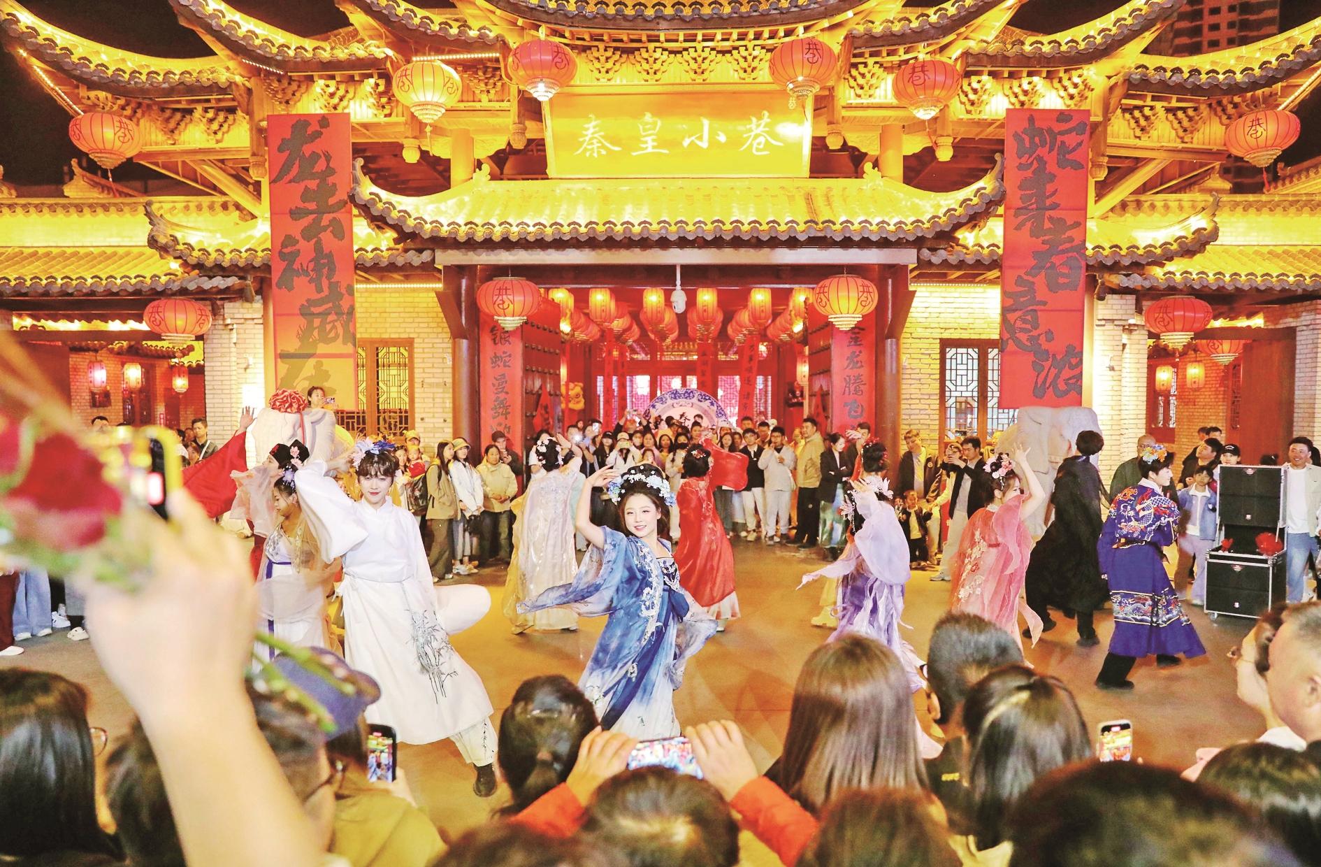 5月3日,游客在河北省秦皇岛市海港区秦皇小巷观看舞蹈演出。 新华社发(曹建雄 摄)