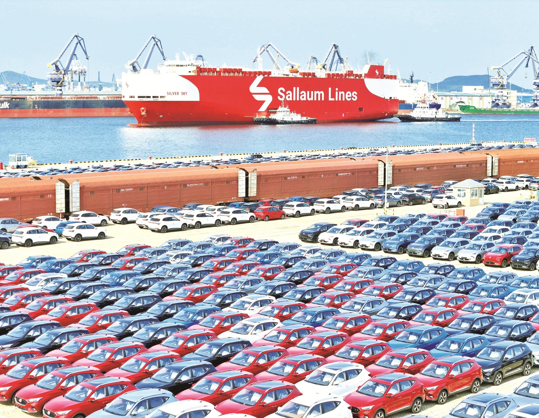 9月14日,国产汽车在山东港口烟台港集结等待装船出口(无人机照片)。 新华社发(唐克 摄)