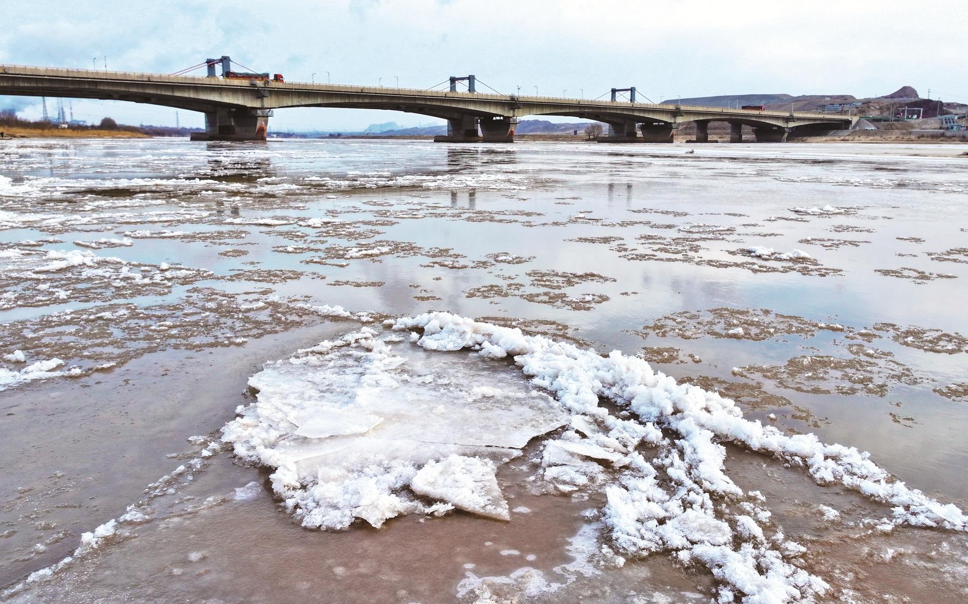 这是1月5日在宁夏石嘴山市惠农区拍摄的黄河流凌(无人机照片)。近日,受寒潮天气影响,黄河宁夏石嘴山段出现流凌景观,大面积的冰凌随着水流相互碰撞,构成一幅美丽的冬日画卷。