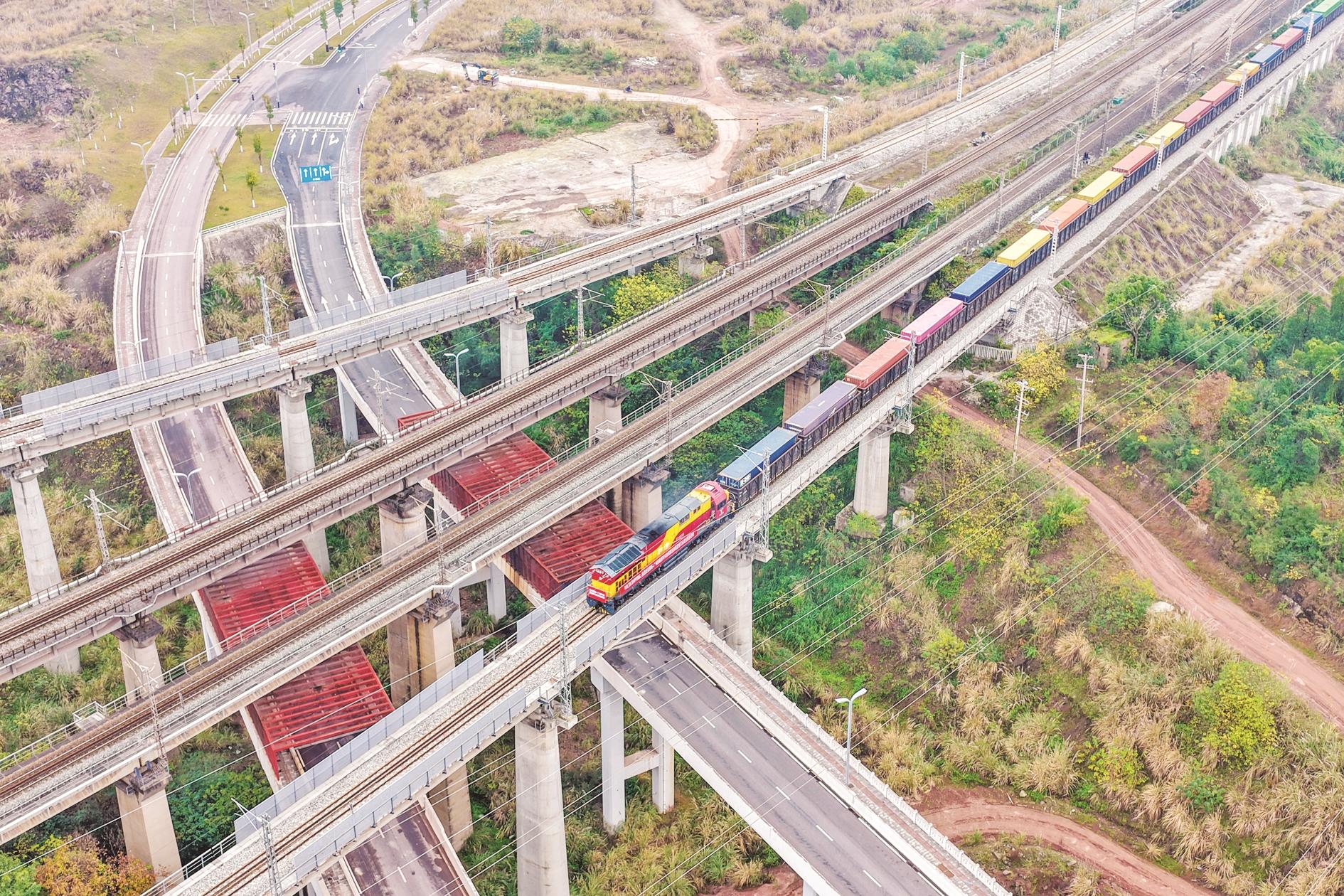 1月7日,铁海联运“重庆造”新能源汽车专列在重庆果园港鱼嘴站顺利发车(无人机照片)。
