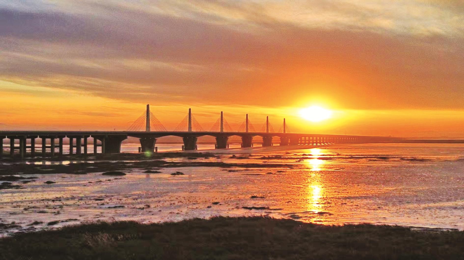 冬日的乌海湖上,大桥在落日余晖中勾勒出清晰剪影,金色霞光透过桥身铺洒在冰封的湖面,光与影交织间,一幅壮阔的塞上冬日日落图景铺展眼前。(赵政宇 摄)