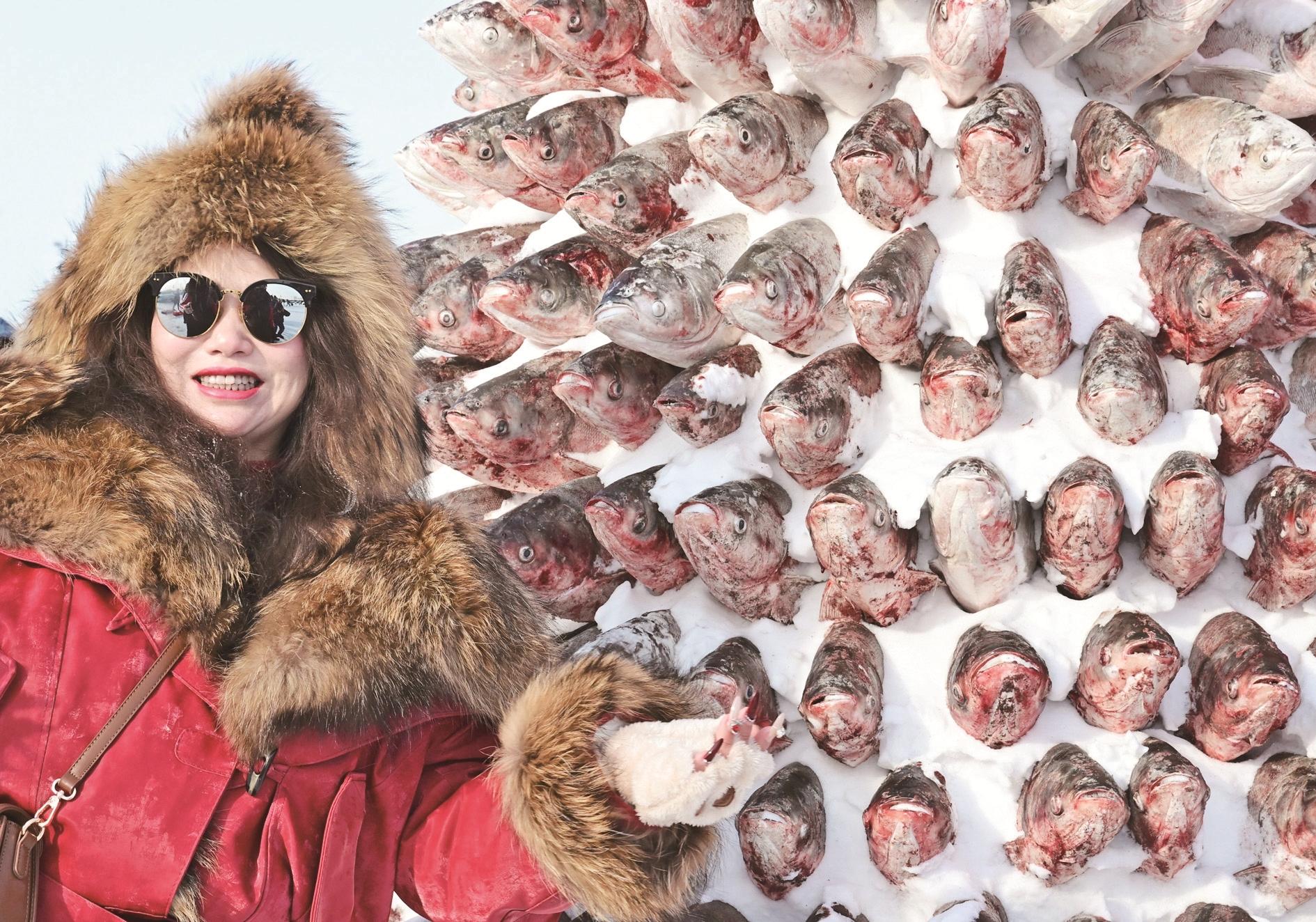 1月10日,在黑龙江省肇东市大似海冬捕渔猎文化节上, 游客在“冻鱼塔”前留影。眼下正值“三九”时节,各地百姓生活烟火气正浓,为寒冬带来人间温暖。 新华社发(杨威 摄)