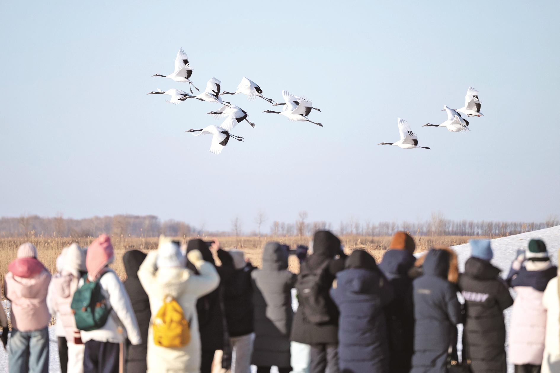 1月21日,游客在黑龙江扎龙国家级自然保护区内观看丹顶鹤。冬日时节,黑龙江扎龙国家级自然保护区内白雪皑皑,丹顶鹤在寒风中觅食,上演一幅鹤舞冬日的纯净画面。