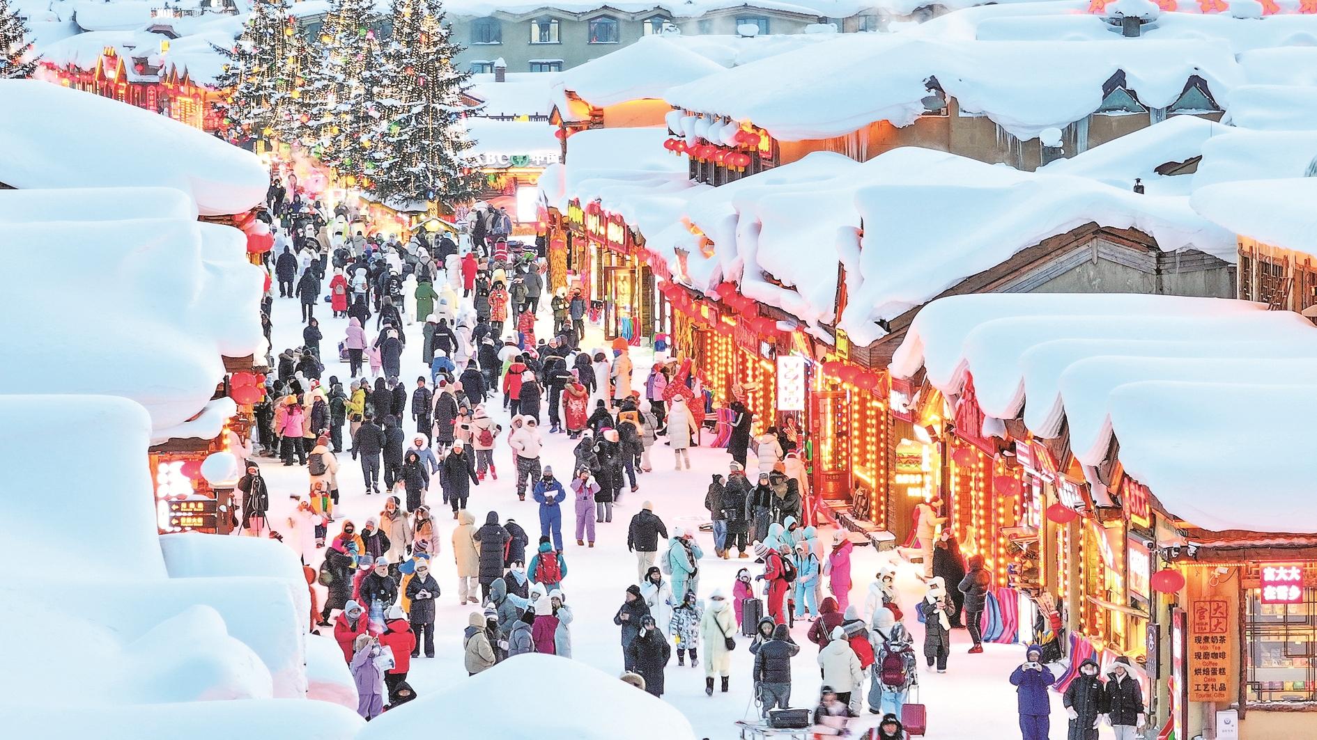 1月17日,游客在位于黑龙江省牡丹江市的“中国雪乡”景区游玩(无人机照片)。新华社发(何华文 摄)