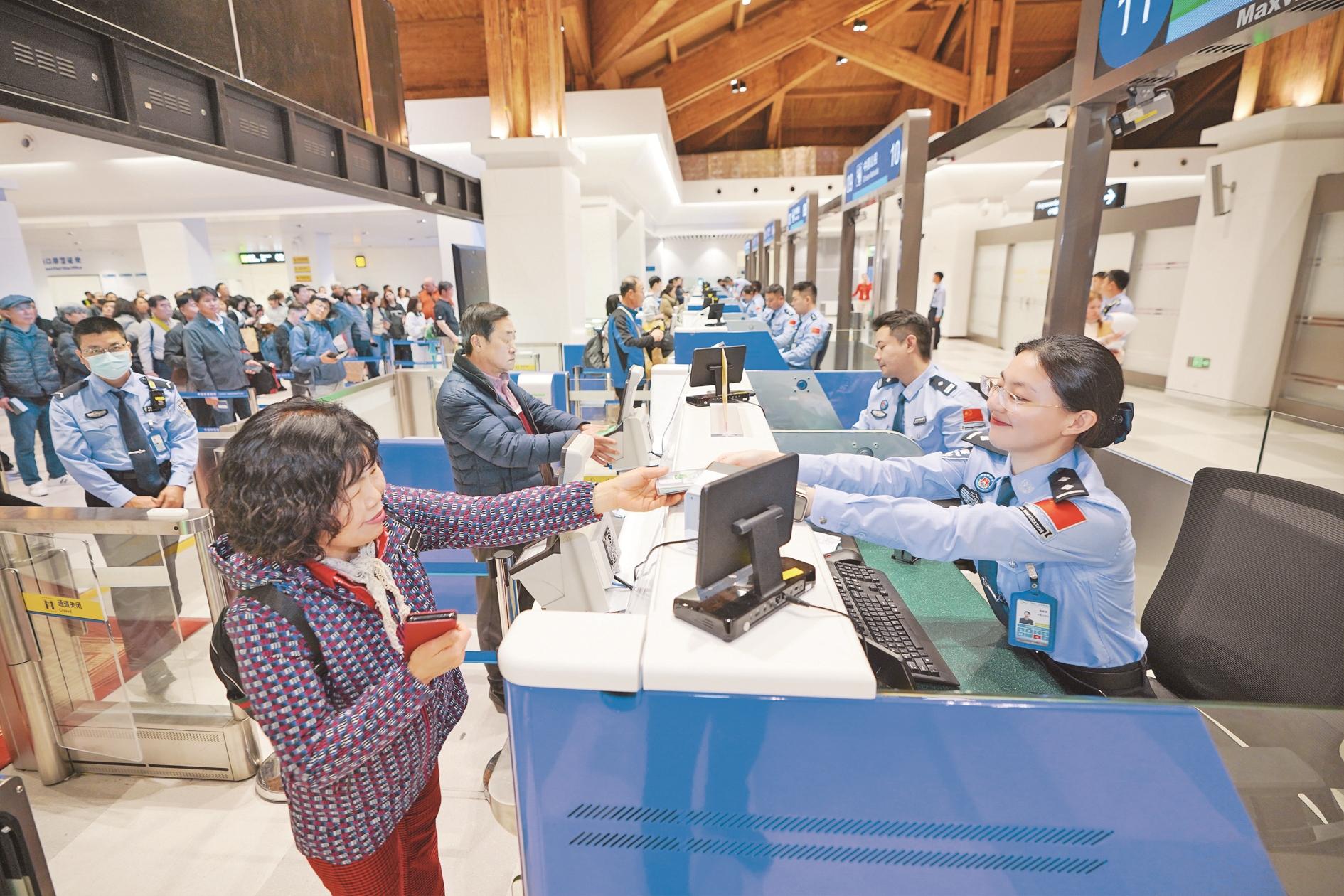 凤凰出入境边防检查站民警为外籍旅客办理入境手续(1月15日摄)。1月18日,海南自贸港封关“满月”。封关运作以来,海南政策效应持续释放,出入境人员往来活跃、态势良好。新华社发(杨冠宇 摄)