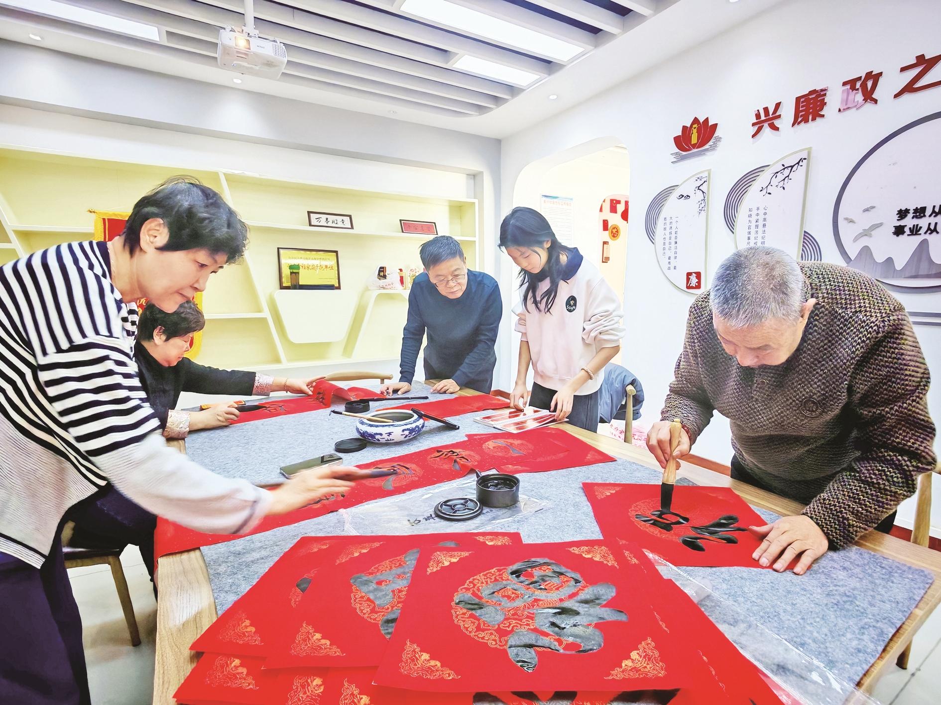 1月20日,五虎山街道复兴社区新时代文明实践站以“翰墨飘香迎新春,社区志愿传温情”为主题,组织开展了写春联活动。书法志愿者与辖区内热爱书法的居民、青少年齐聚一堂,以笔为媒、以墨传情,共同书写新春祝福。 (李娜 摄)