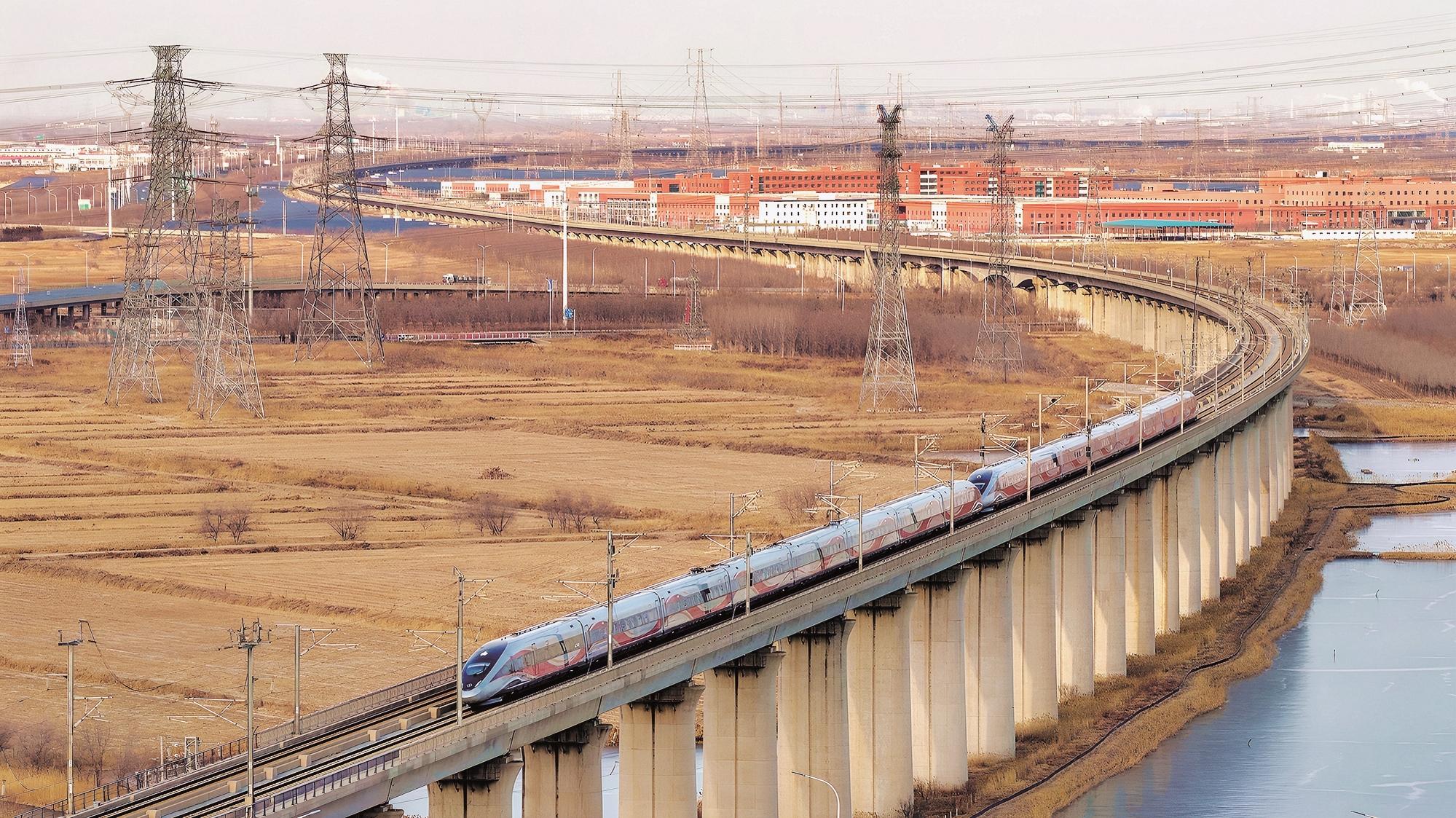 1月25日,动车组列车行驶在天津市境内(无人机照片)。