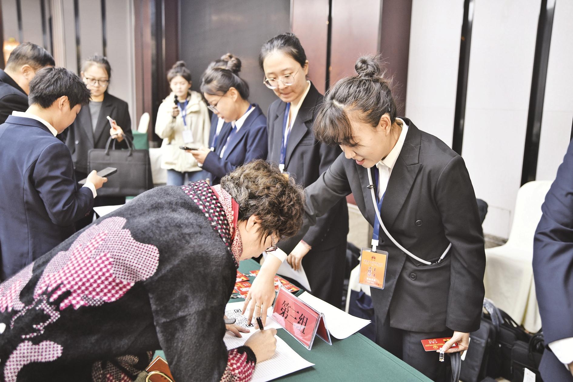 1月27日上午,出席乌海市第十届人民代表大会第七次会议的人大代表陆续向大会报到。报到现场,在工作人员的热情引导下,代表们有序核验信息、办理报到手续、领取会议资料。谈及即将开幕的大会,代表们个个精神饱满、意气风发,言语间既有依法履职、为民发声的坚定担当,更有对乌海高质量发展的殷切期盼与美好憧憬。(贺雅君 摄)