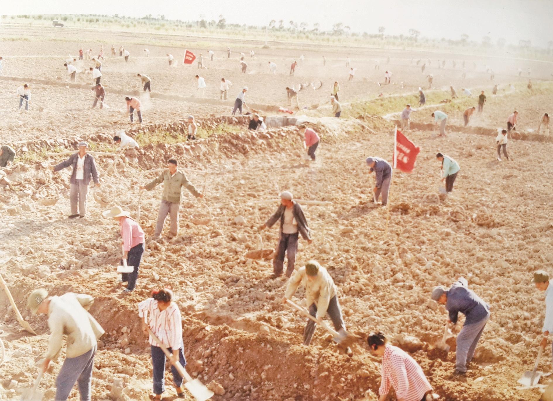1975年春,农田修渠打堰。(资料图)