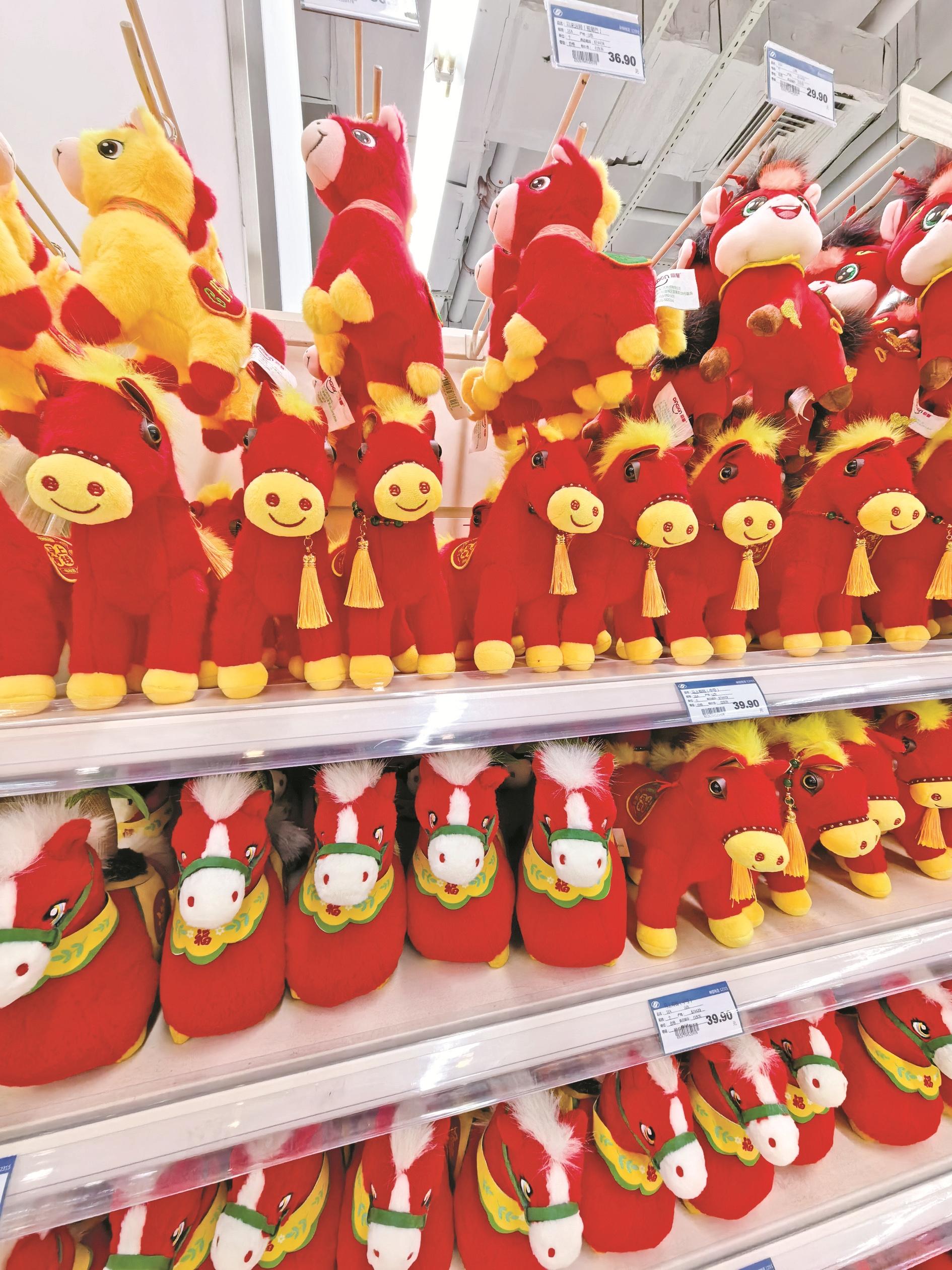在海勃湾区千里山街一家商场内,红彤彤的年货早已摆上货架。春联、福字、灯笼应有尽有,最吸引人的莫过于货架上的“小马”挂件。它们各有各的姿态,再搭配上“中国结”“红流苏”“铜铃铛”“金元宝”等,创意中透着喜庆,价位也多在二十元左右,颇受小朋友的喜爱。在一些百货店内,毛绒玩具中的小马玩偶最让人爱不释手,它们大多浑身覆盖着蓬松的绒毛,摸起来软乎乎的,就像云朵一般,让人总想抱一抱,它们的模样或慵懒、或俏皮、或惬意,让人感受到春节临近的松弛与美好。