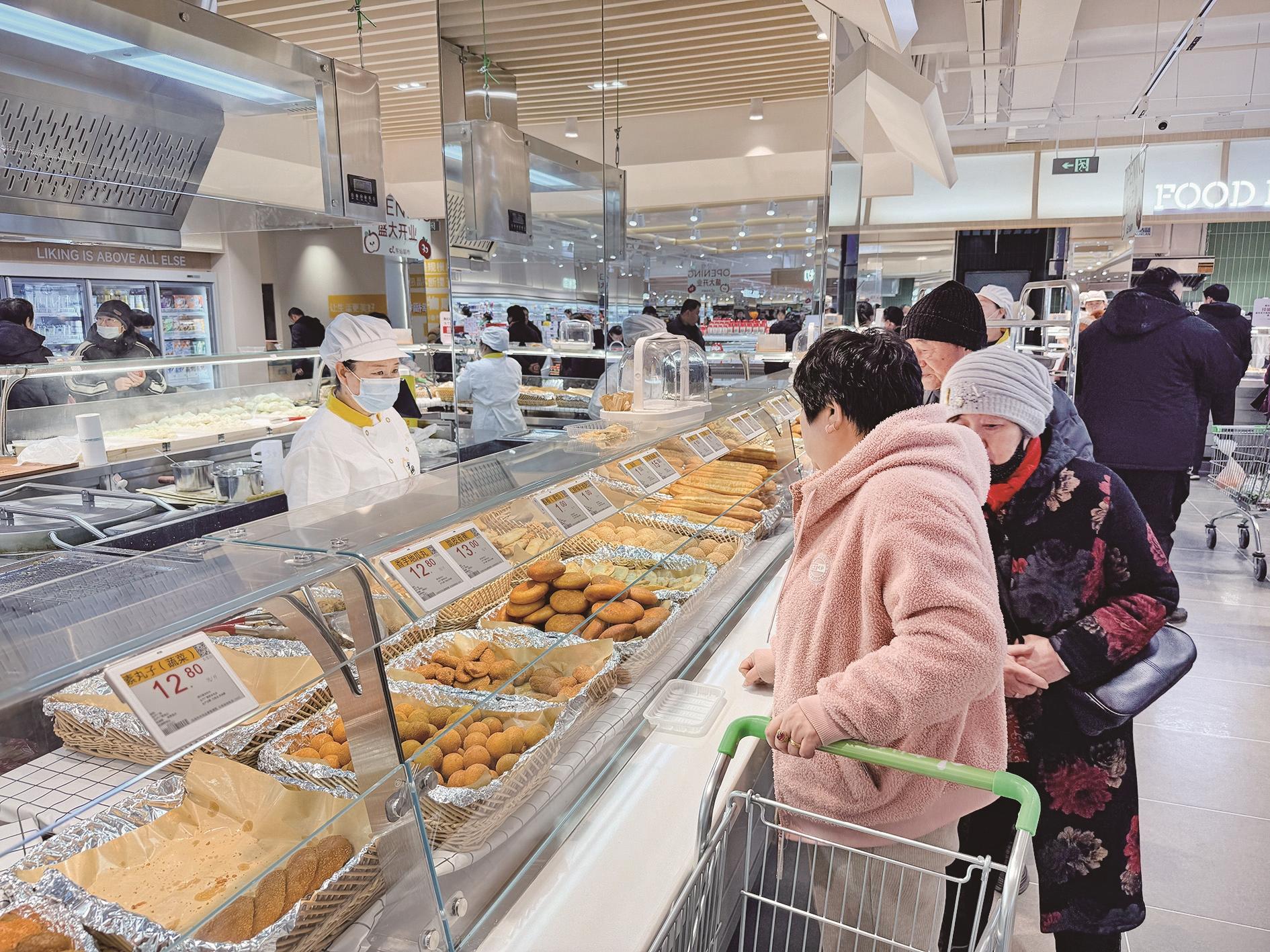 在中央厨房专区,刚出锅的饭菜冒着热气,熟食、面点、凉拌菜分区陈列,一目了然。一旁的堂食区干净整洁,几位居民正在用餐。“家门口新开的超市很方便,菜品新鲜,还能堂食。”市民高海娇端着刚出锅的麻辣烫,笑着对记者说。