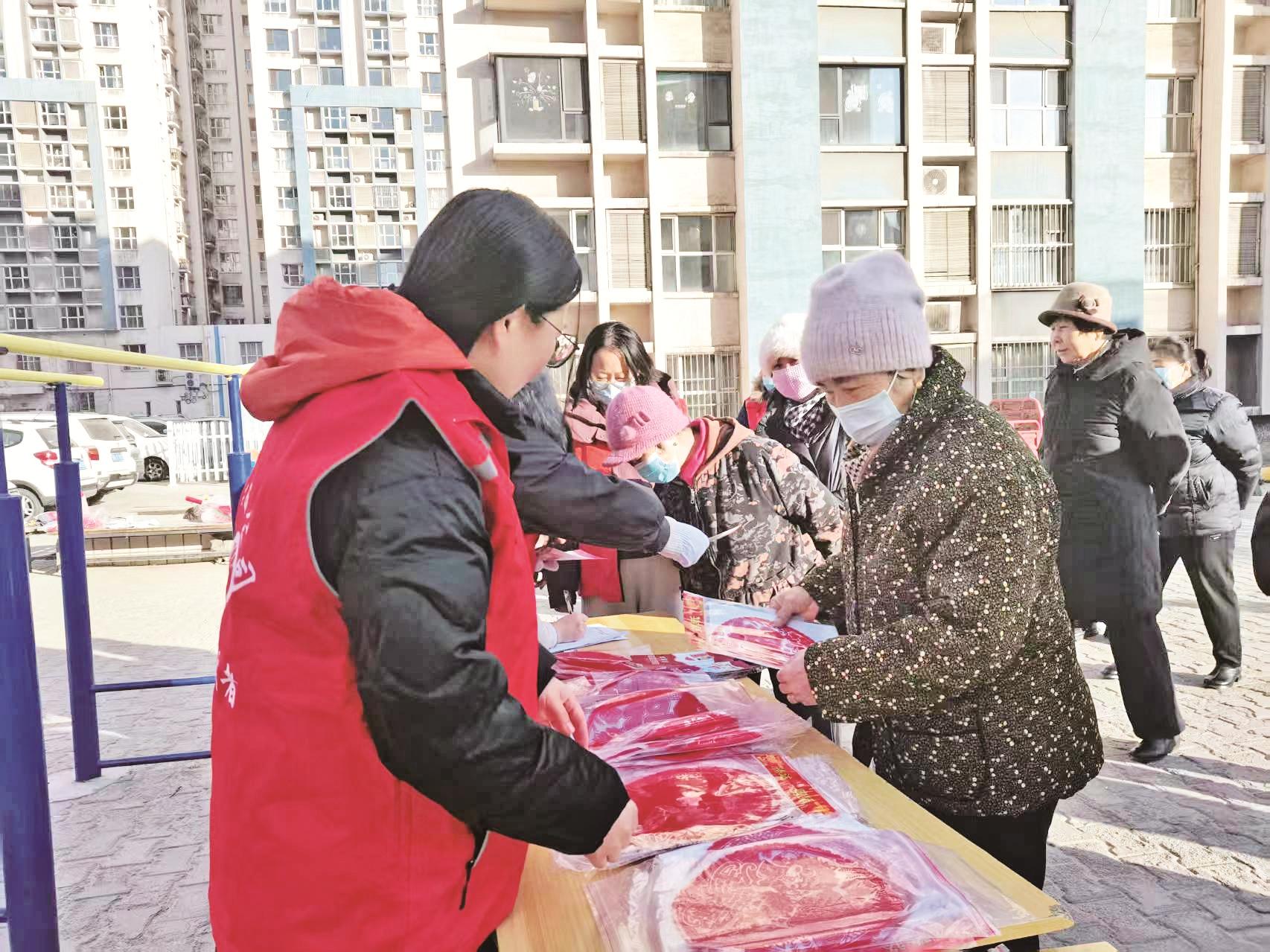 近日,海勃湾区海北街道青山社区联合辖区包联单位、物业公司开展节前送祝福活动。社区工作人员为居民免费发放春联,送上新春美好祝福。 (刘春霞 摄)