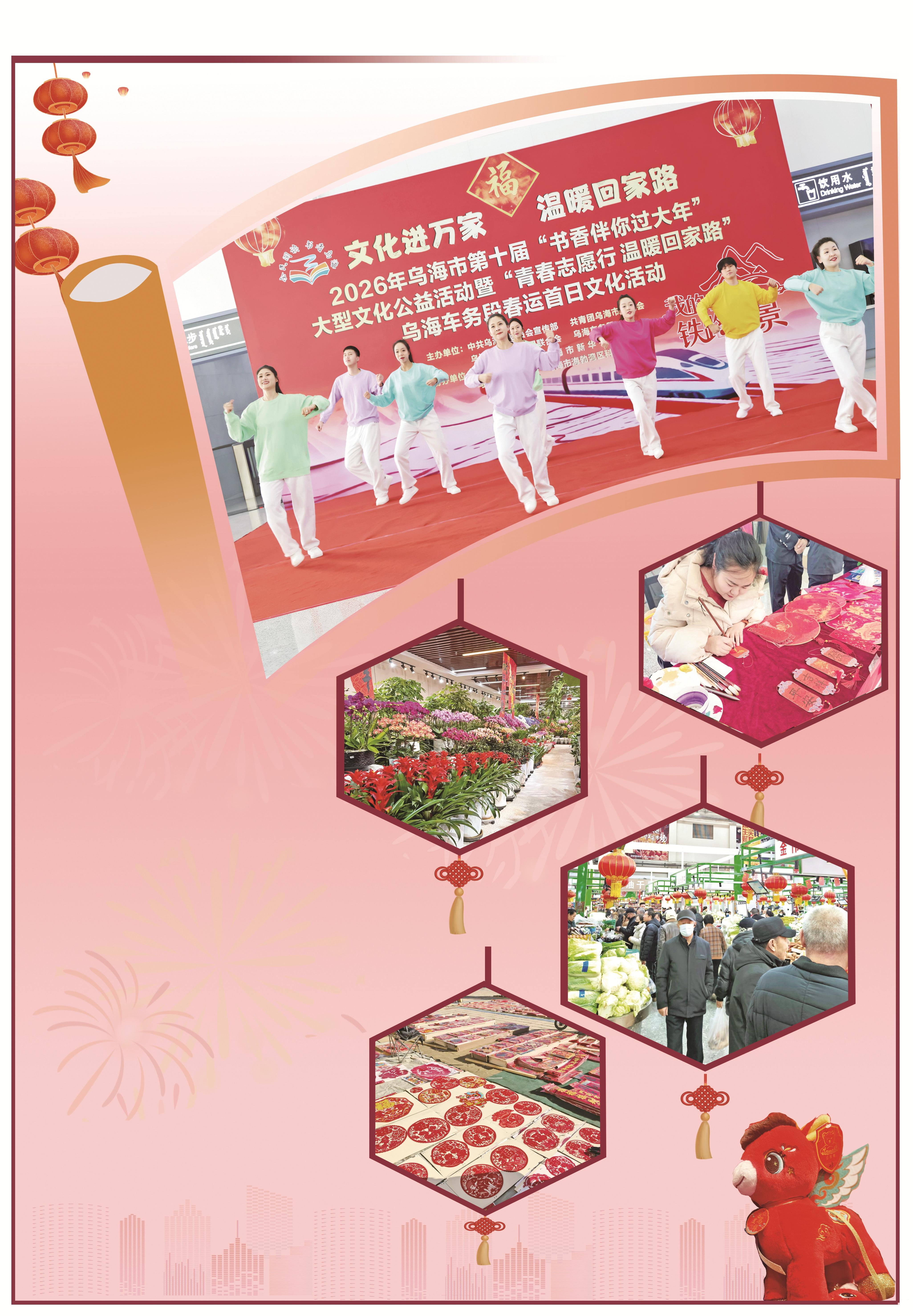 近日,乌海站候车大厅内暖意融融、年味升腾。我市第十届“书香伴你过大年”大型文化公益活动为旅客带来了融融暖意。文艺表演、赠图书、写春联、新春留影、现场义诊、非遗展示等一系列丰富多彩的活动有序开展,让旅客收获了满满的新春祝福。