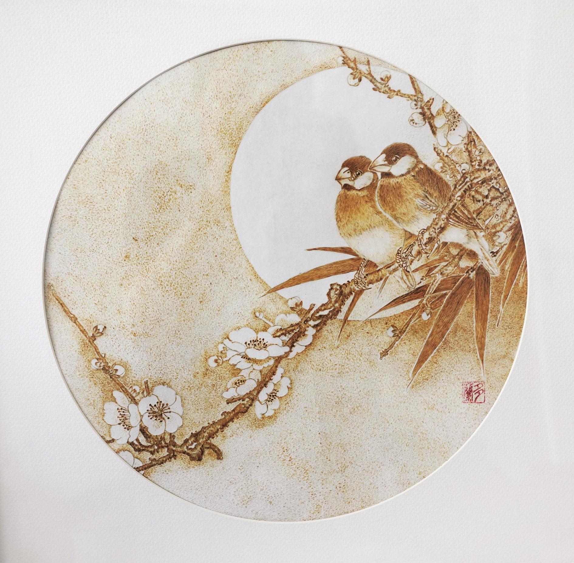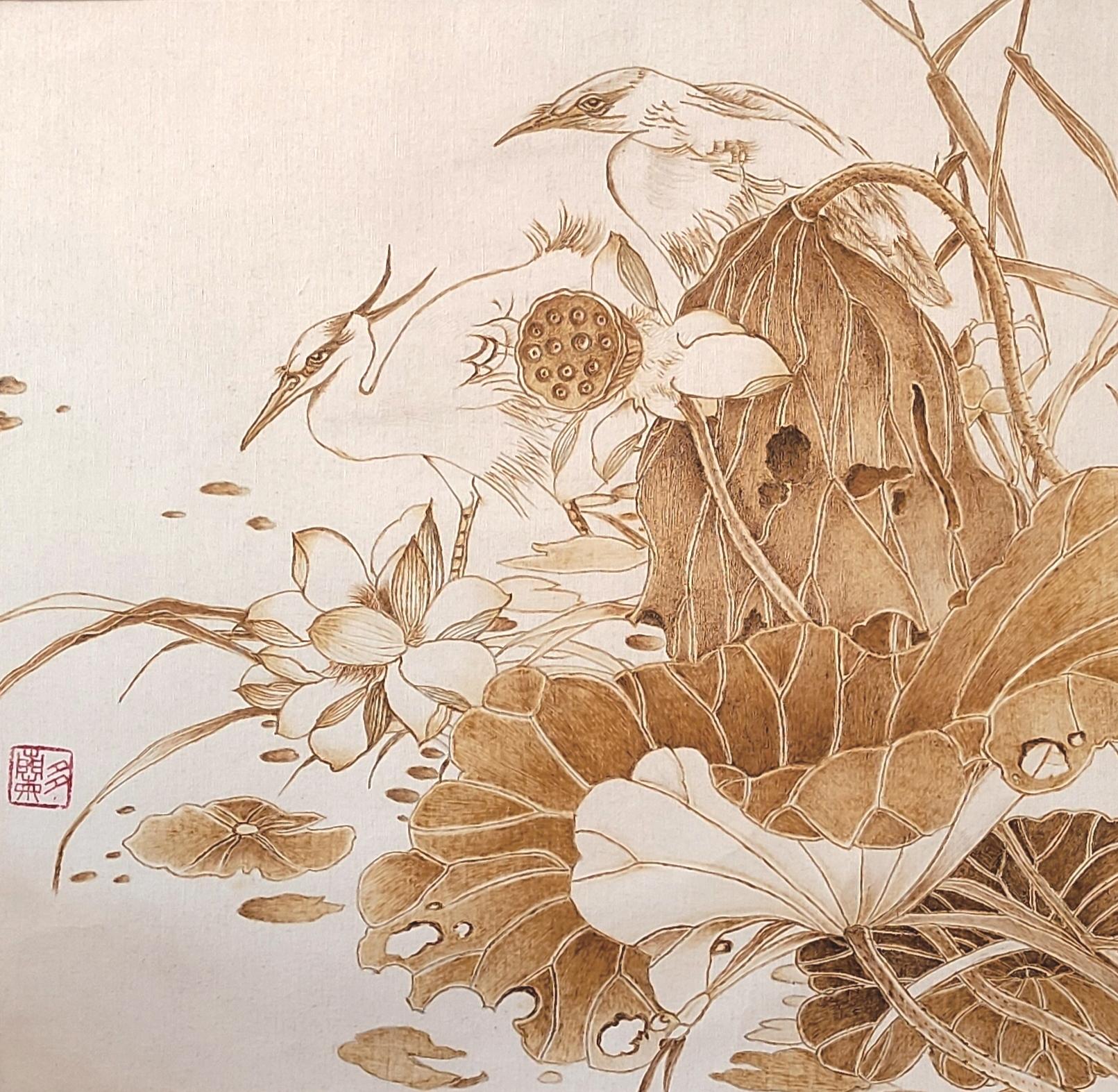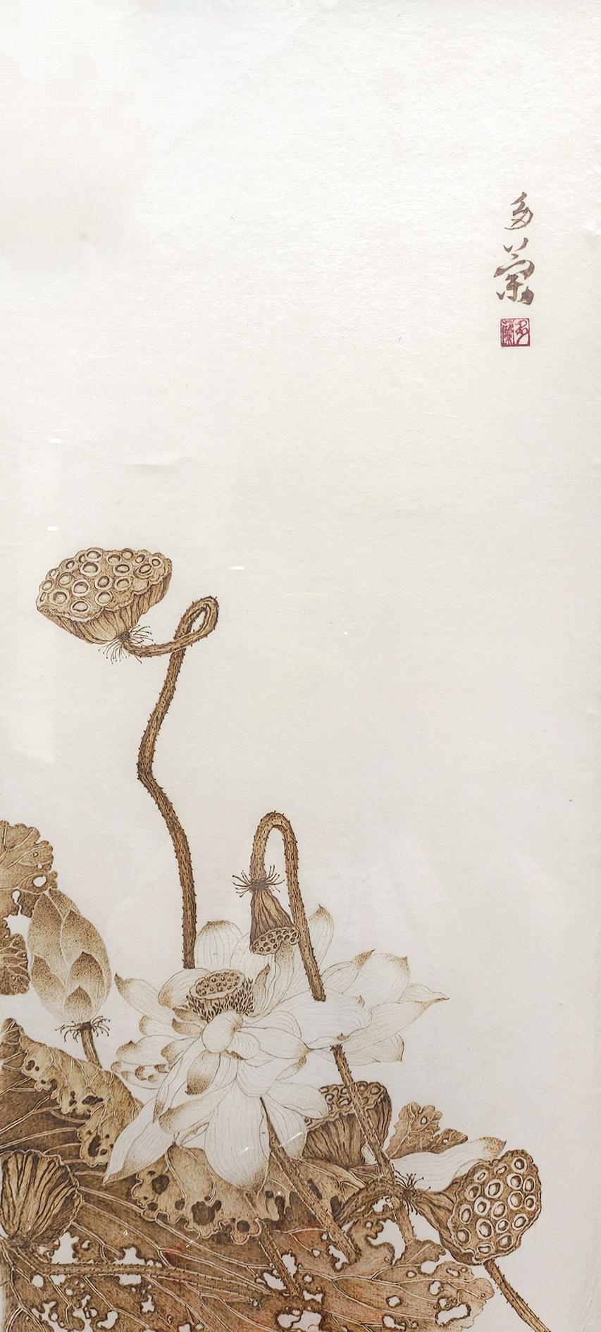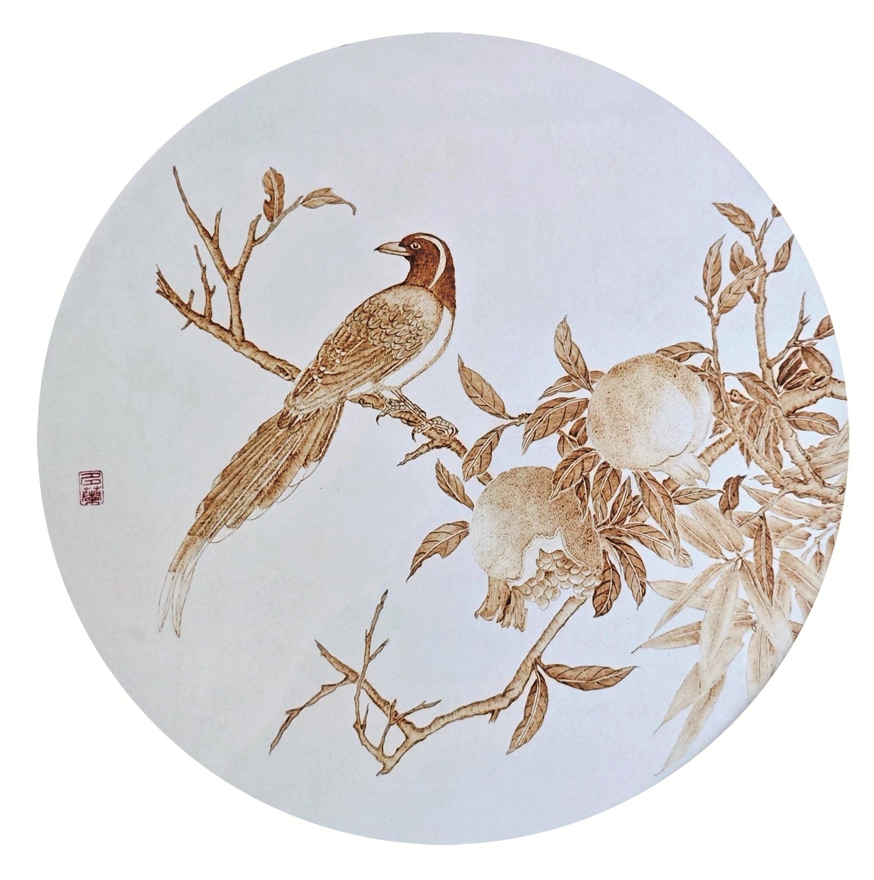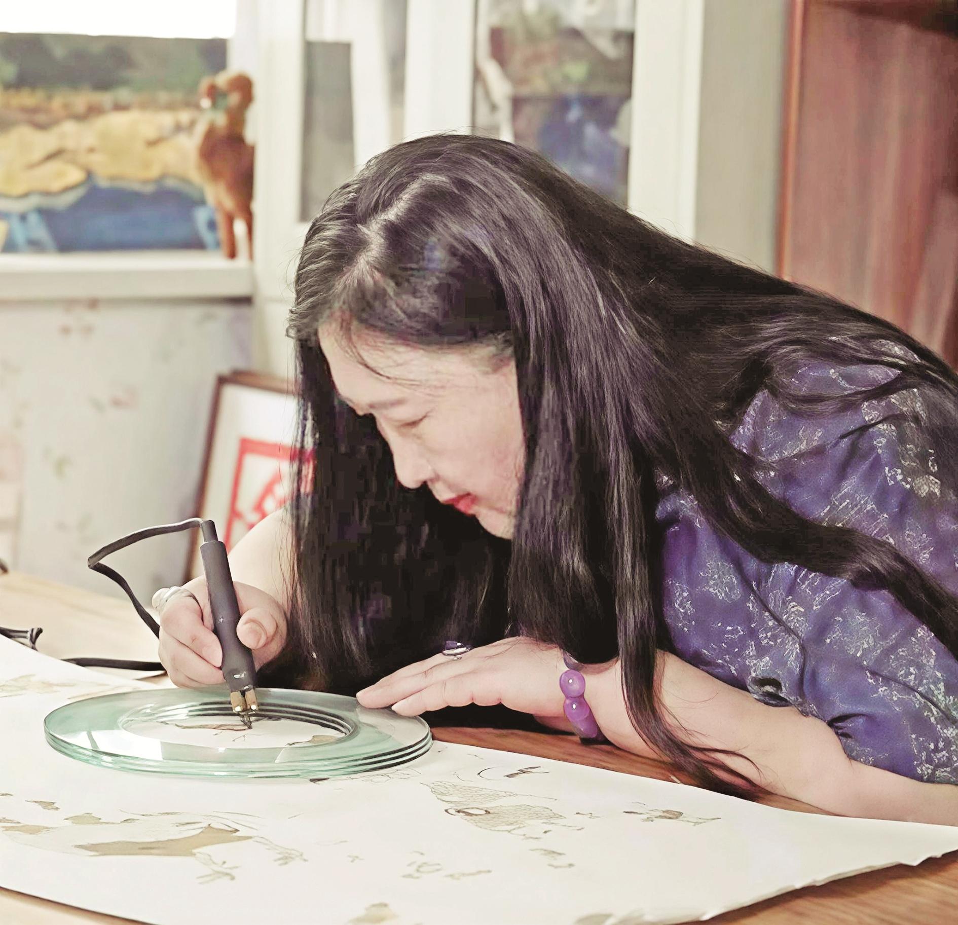 2010年,一次邂逅,让她与烙画结下不解之缘。初见烙画,那种通过高温烙铁在宣纸上“烫”出的山川花鸟,线条遒劲、焦痕成影,深深吸引了有着美术功底的张丽军。她说:“这正是我寻找的,融合绘画与独特材质、充满挑战的艺术。”张丽军当即购置电烙笔,开启烙画之路。可宣纸娇贵,温度稍高便焦黑穿孔,稍低则留痕模糊,无数次失败后,她终于摸索出技巧,创作《草原英雄小姐妹》时,以写意手法突破具象束缚,完成了首幅作品。