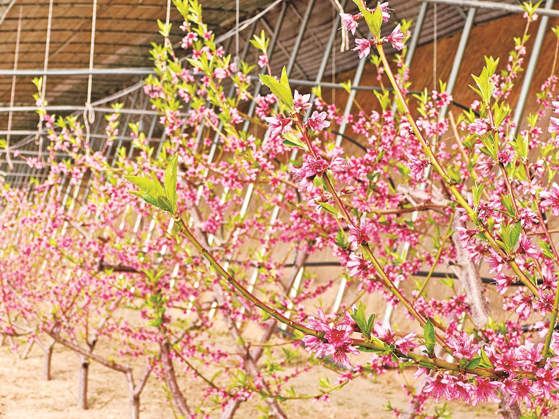 乌海市新义丰农业科技发展有限公司大棚内春意盎然,桃树、李子树竞相吐蕊,粉白花瓣层层叠叠,蜜蜂穿梭其间,呈现一派早春盛景。 (王蒙 摄)
