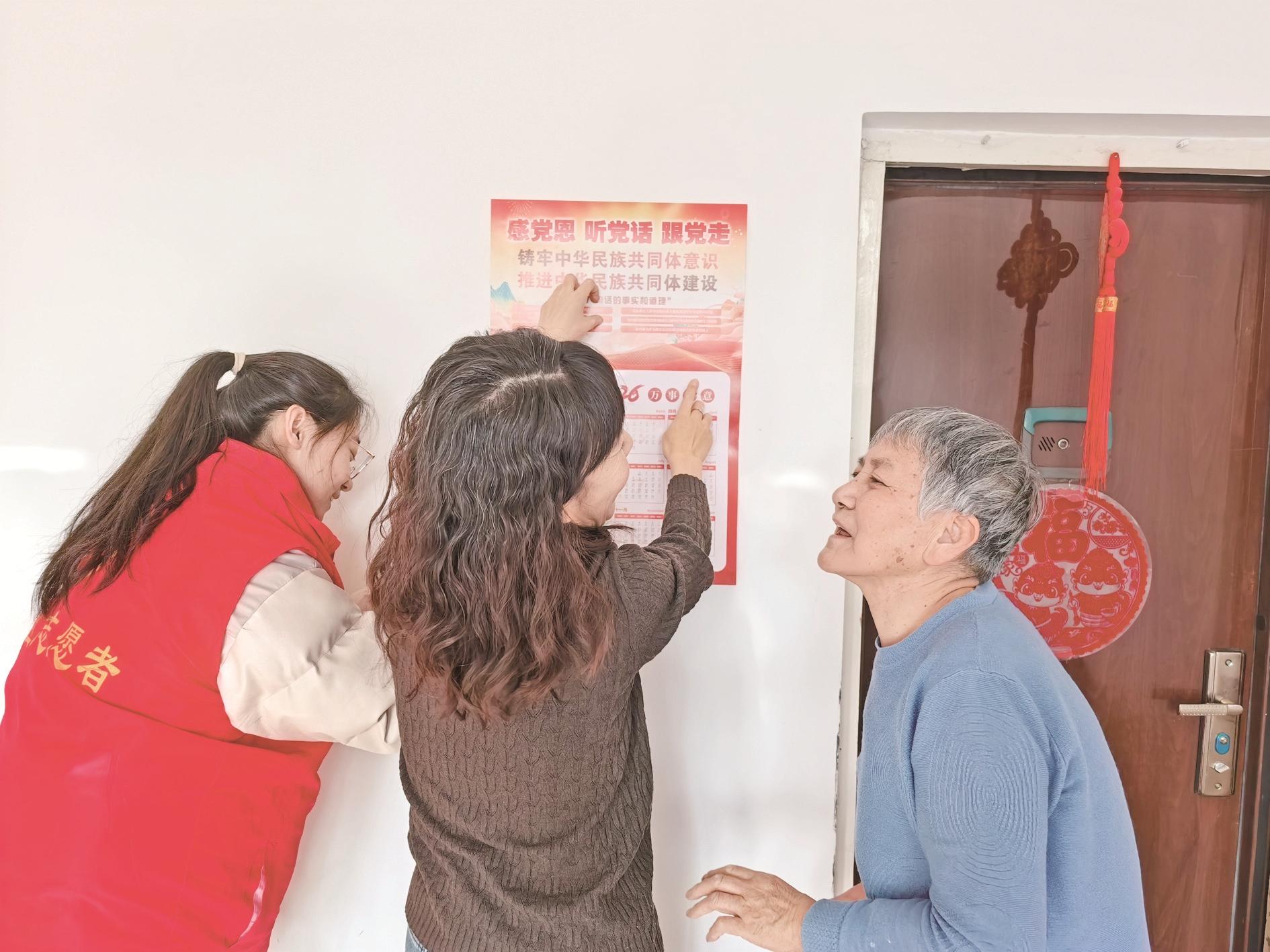 近日,西卓子山街道办事处工作人员深入居民家中,张贴民族团结进步宣传画,并为居民讲解相关政策。 (鲁吟 摄)