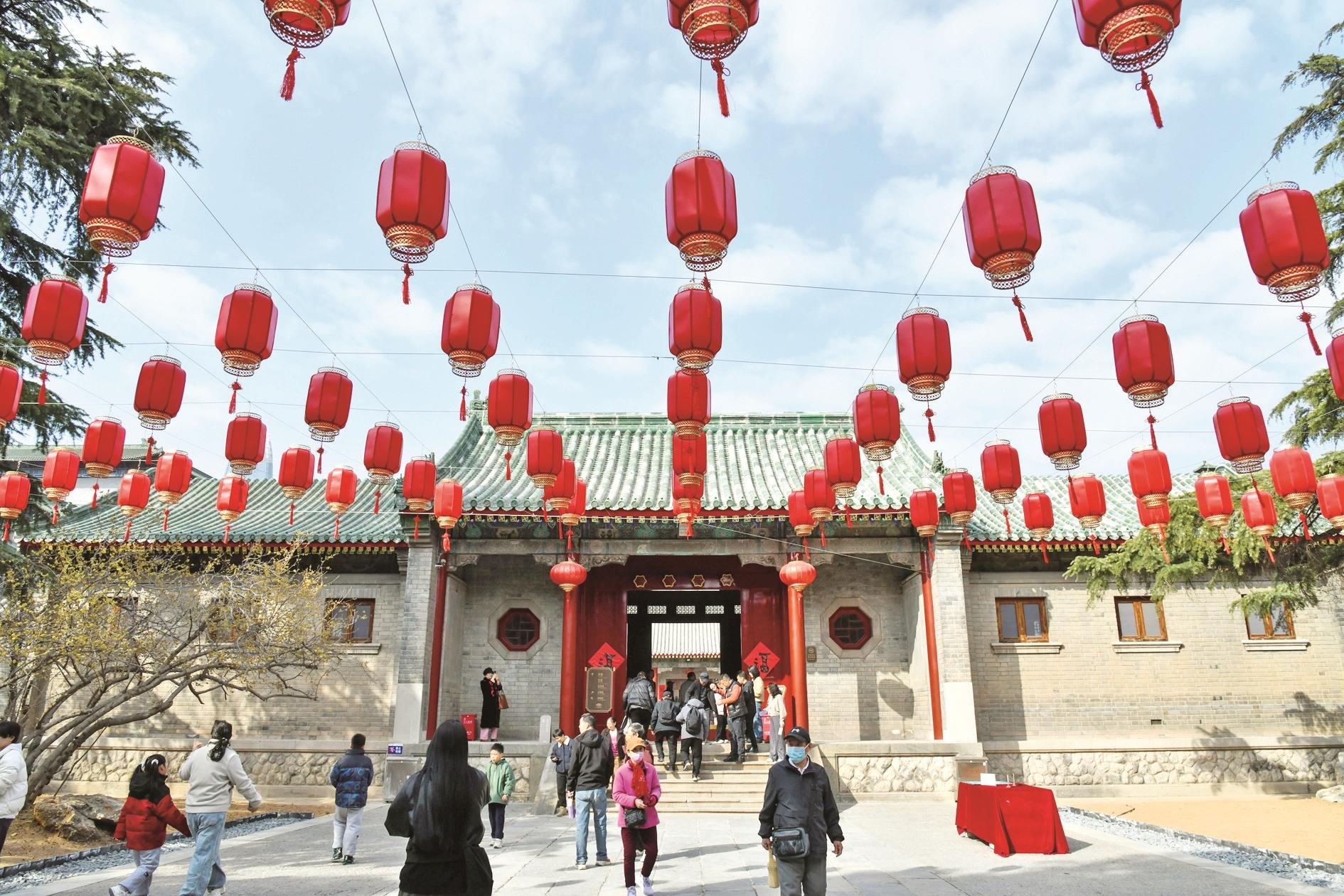 2月24日,人们在山东古建筑博物馆参观。经整体修缮保护,位于济南市上新街的山东古建筑博物馆近日向公众开放。山东古建筑博物馆依托万字会旧址济南母院设立,是山东省首座收藏、研究、展示中国传统建筑构件、技艺及发展历史的专题性博物馆。万字会旧址济南母院始建于1934年,建筑群由四进院落构成,是全国重点文物保护单位。