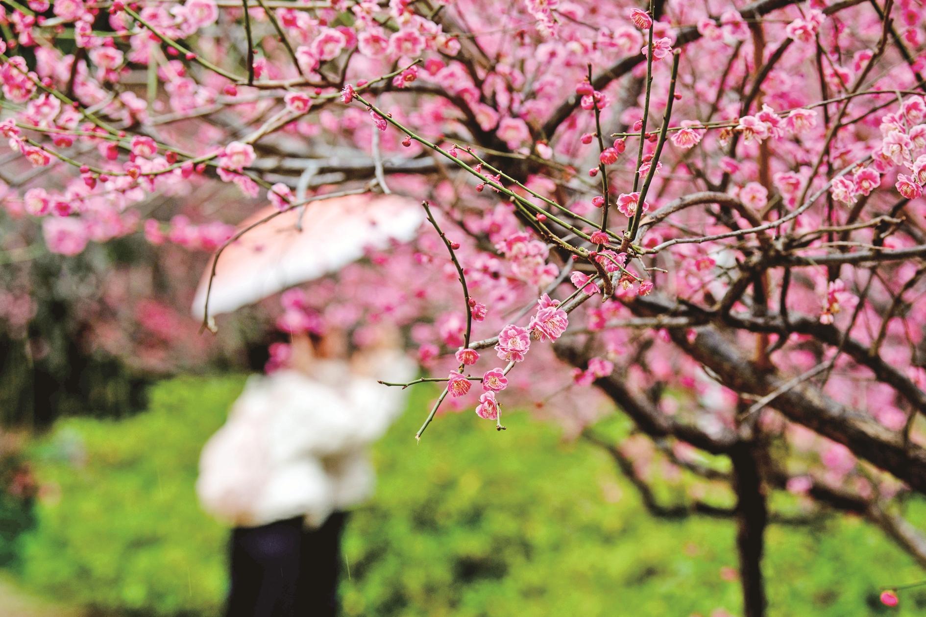 3月1日,在江苏省泰州市梅兰芳公园,游客冒雨赏花。一场春雨过后,晶莹剔透的雨珠缀满枝头,勾勒出别样春日景致。