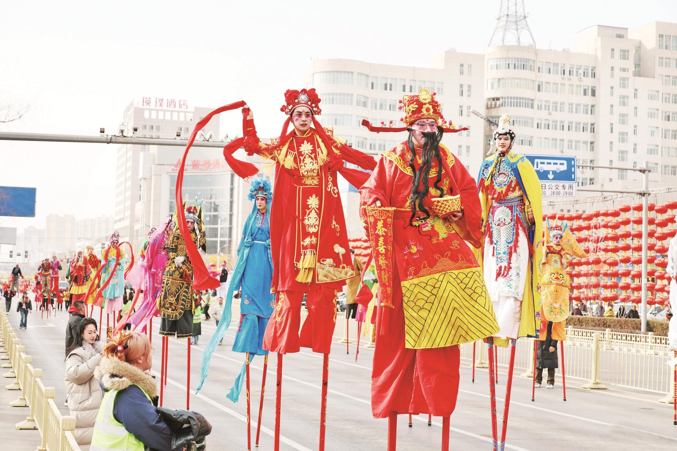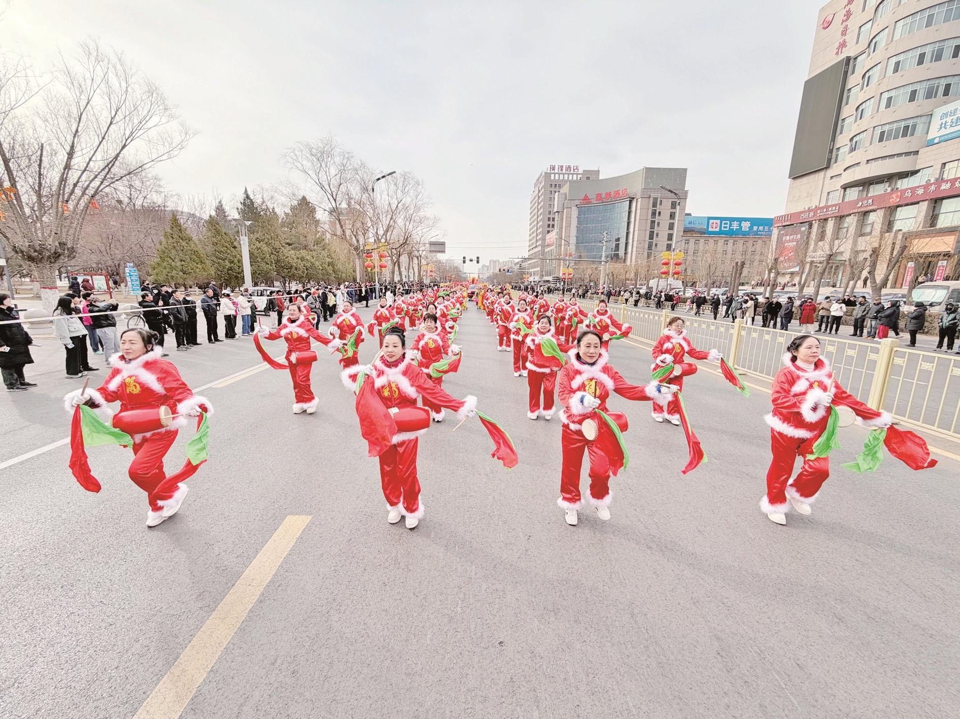 3月3日,农历正月十五元宵佳节,我市三区开展丰富多彩的社火巡演活动。参加巡演的社火队伍早早集结,身着艳丽的服装,手持彩扇、花伞,身系腰鼓,踏着铿锵有力的鼓点一路巡游。舞龙舞狮、扭秧歌、踩高跷等特色民俗表演轮番亮相,吸引了市民驻足观赏。图为海勃湾区“盛世闹元宵·欢腾海勃湾”社火巡演活动现场。 高瑞鹏 侯瑞璞 摄 (相关报道详见第二、三、五版)