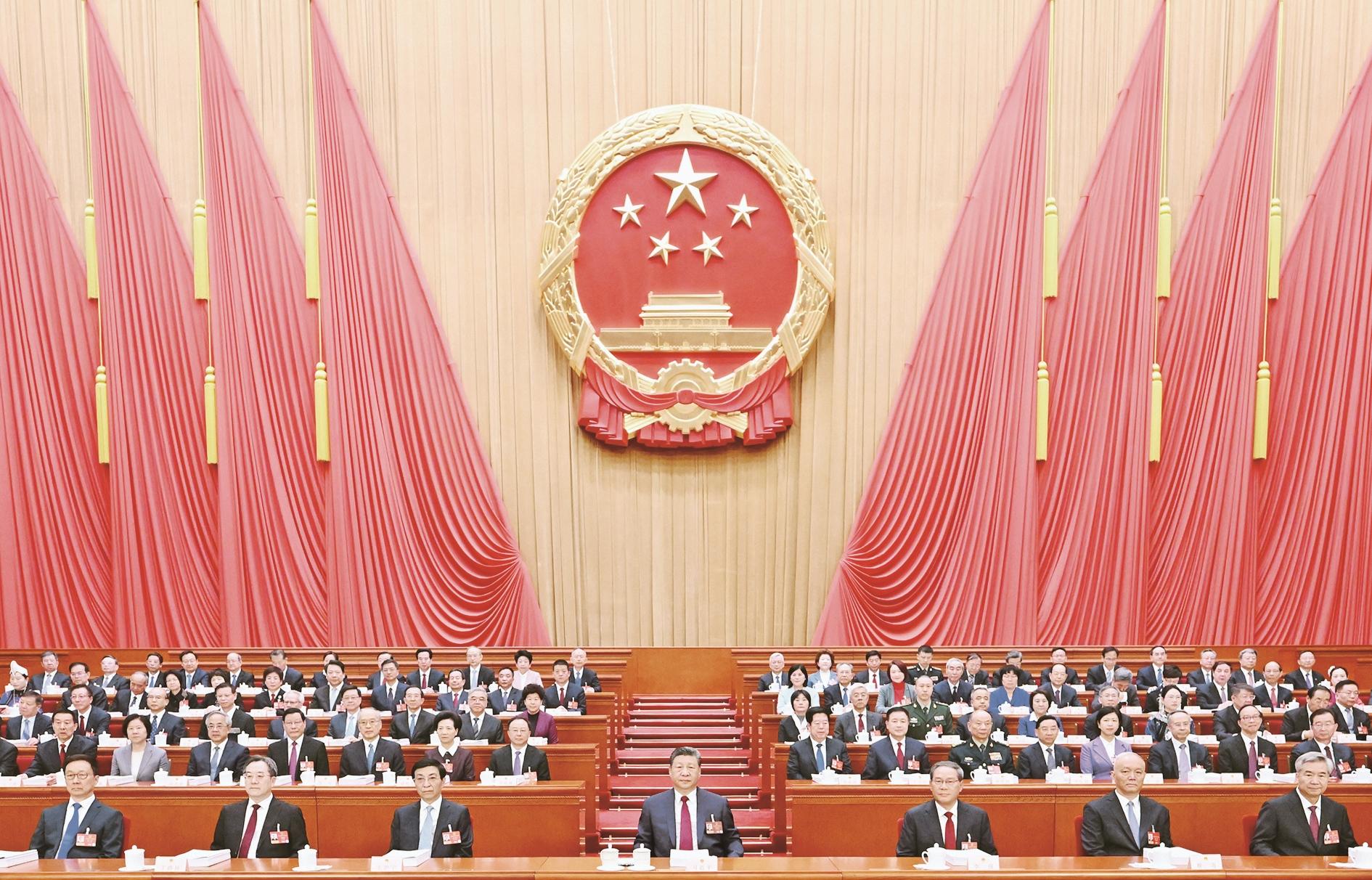 3月5日,第十四届全国人民代表大会第四次会议在北京人民大会堂开幕。党和国家领导人习近平、李强、王沪宁、蔡奇、丁薛祥、李希、韩正等出席大会。 新华社记者 谢环驰 摄
