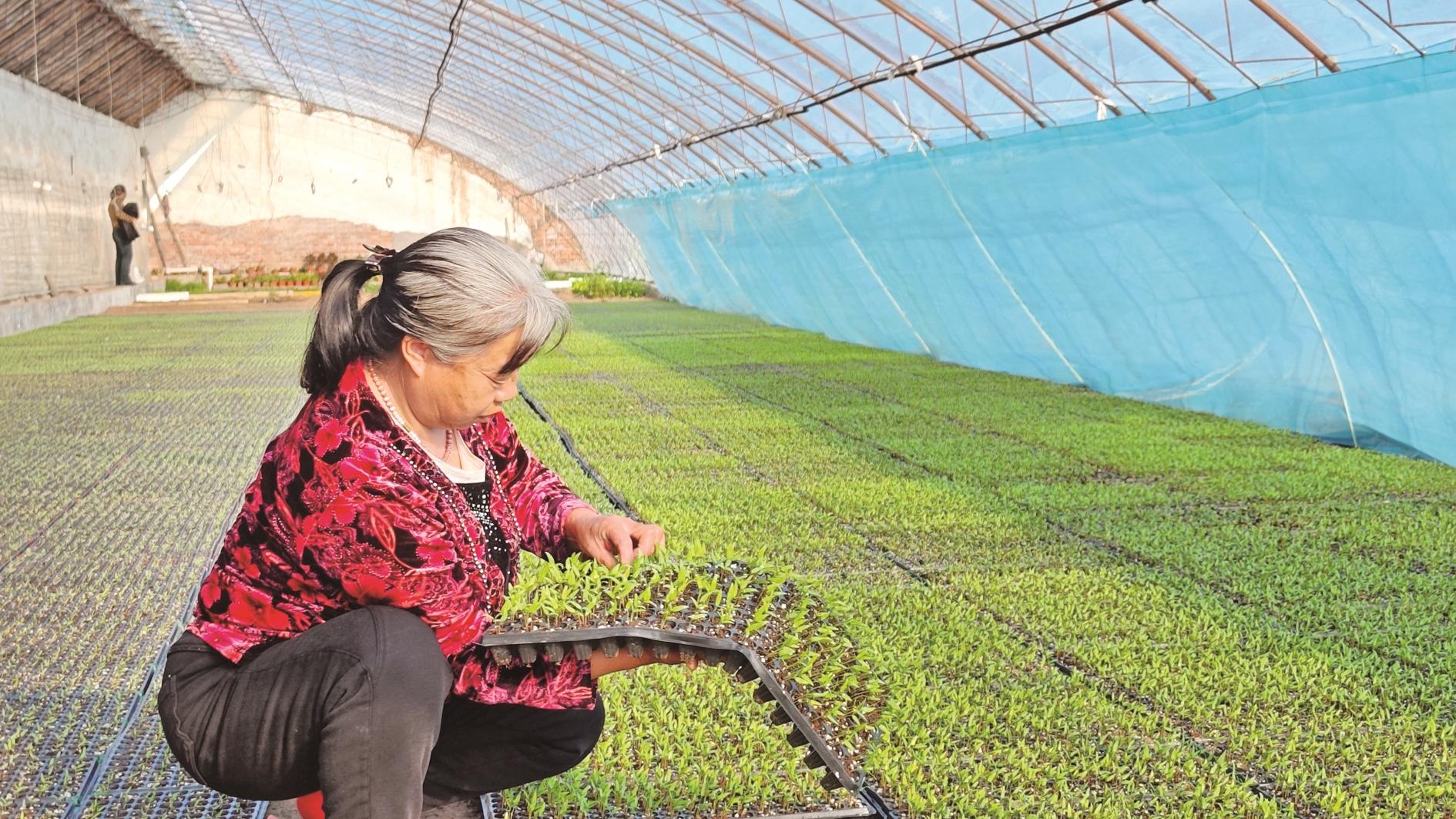 人勤春来早,功到秋华实。在农户杨艳秀的大棚里,又是另一番场景:满眼新绿铺展成片,嫩绿的菜苗整齐排列,生机勃勃。杨艳秀蹲在苗盘前,熟练地整理着菜苗,她说:“这个棚里有柿子苗、茄子苗、黄瓜苗,还有一些草莓苗。这些苗长势都挺好,再过不久就能移栽到地里。就这些小苗,如果管理得好,就能给我们家带来四五万元的收入。”杨艳秀的话语虽朴实,却满含期盼。