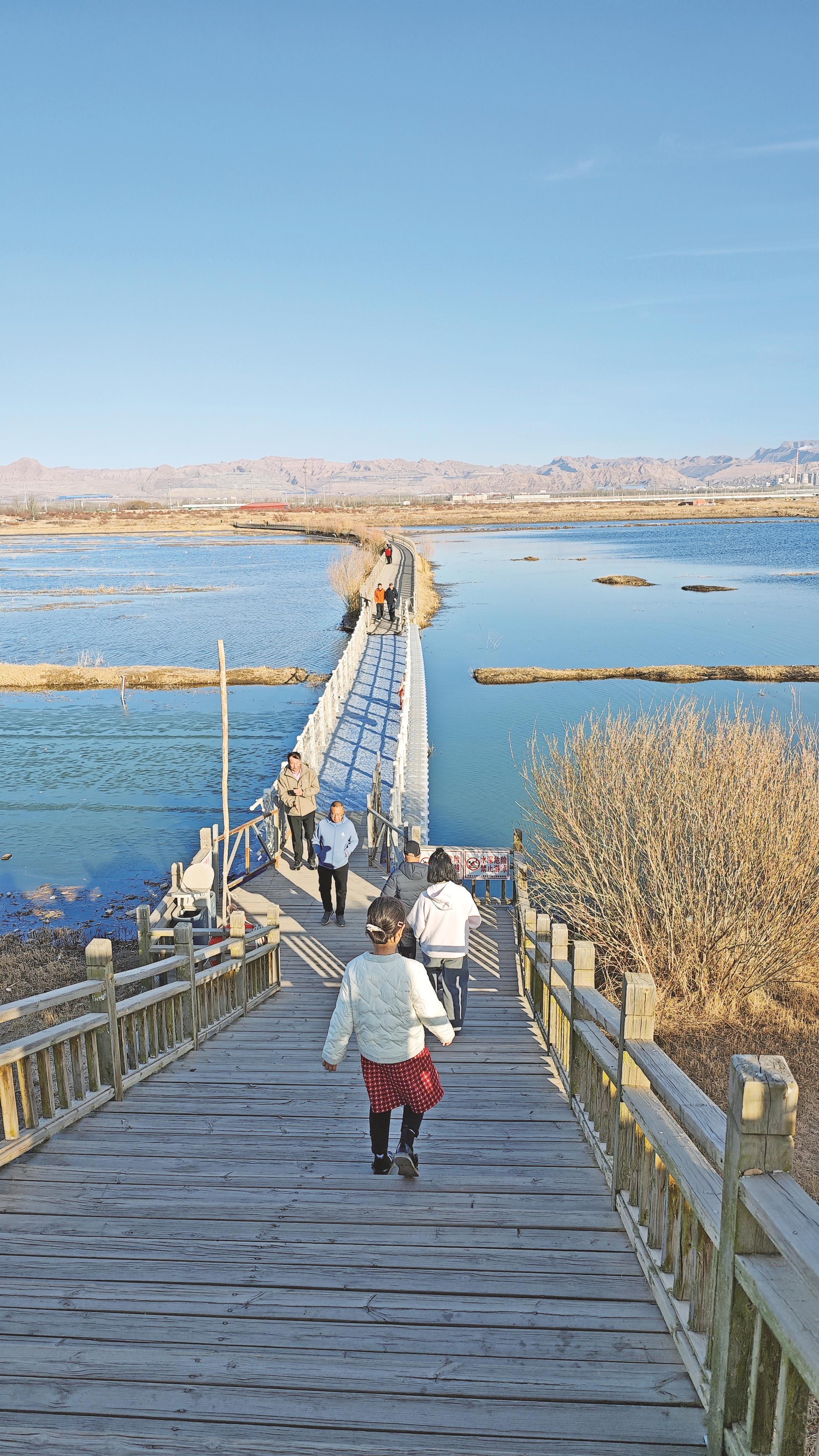 春天的乌海,还有人与自然和谐共处的场景。黄河水面波光粼粼,对岸的乌兰布和沙漠连绵起伏,与水域相映成趣。在龙游湾国家湿地公园里,人们结伴行走在栈道上,感受春风拂面、湖水荡漾的惬意。前来游玩的市民马璐说:“这两天天气非常好,趁着有空就带着父母来龙游湾转一转,让他们感受一下大自然的气息,也看看这里的美景。”