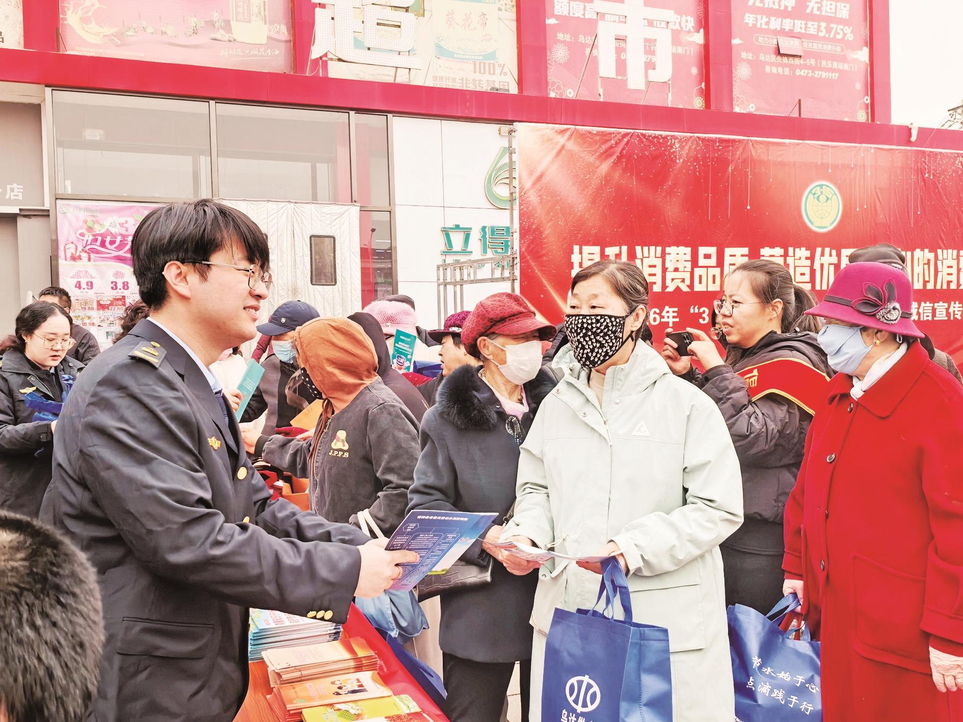 3月13日,乌达区市场监督管理局紧扣2026年“提升消费品质”消费维权年主题,开展“3·15”国际消费者权益日集中宣传、系列宣讲、执法检查及销毁行动,切实筑牢消费安全防线,保障广大消费者合法权益。图为在活动现场,工作人员普及消费权益知识。