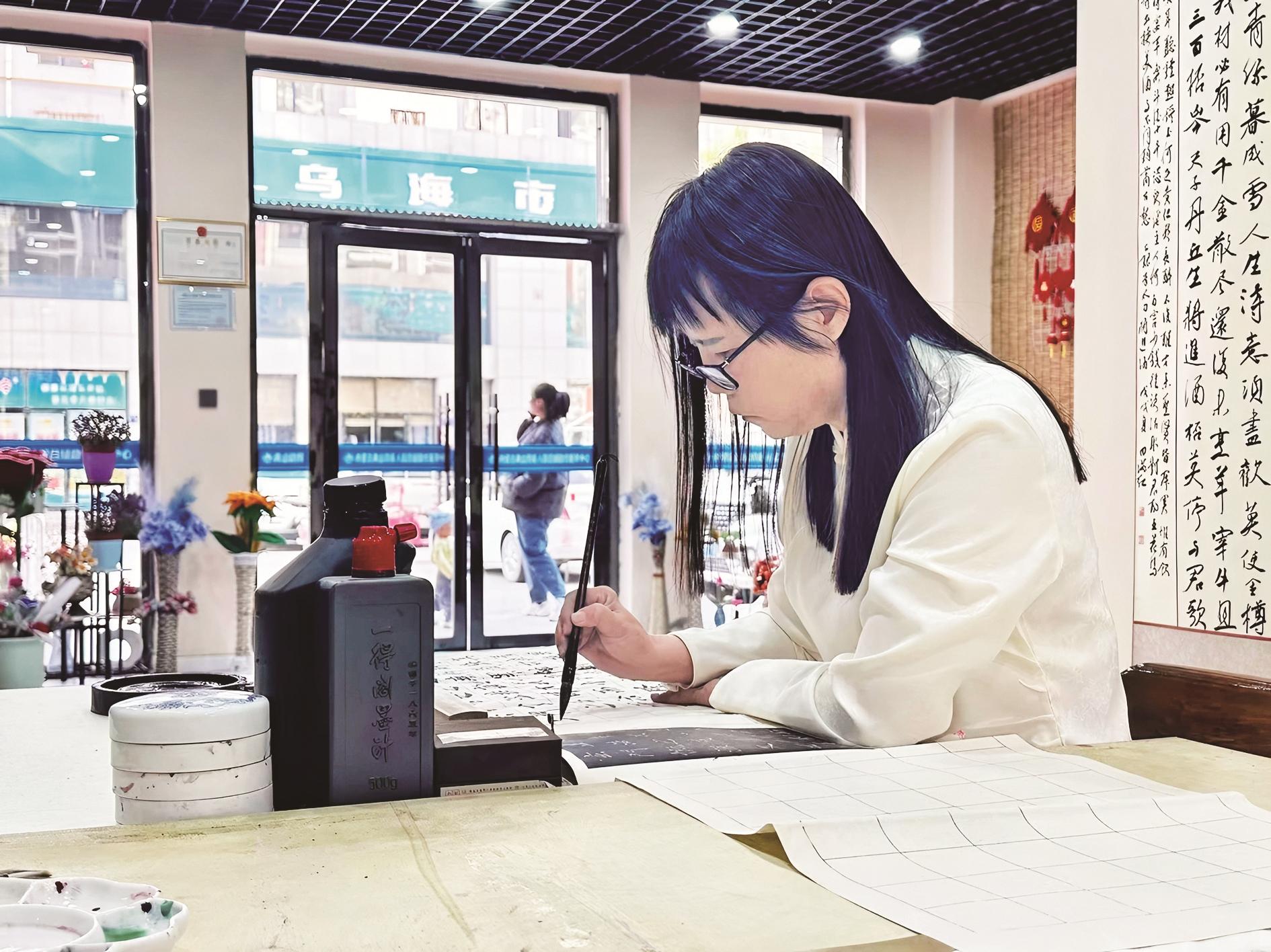 田满红出生于乌海一个普通家庭,童年时光里,那些灵动的线条、端庄的字体,在她心中埋下了好奇的种子。“那时候不懂什么是书法艺术,就是觉得好玩,看着大人们写,自己就想模仿,哪怕写得歪歪扭扭,也特别有成就感。”田满红就这样拿起毛笔,在废旧的报纸上涂画,虽然笔触稚嫩,毫无章法,却乐此不疲。