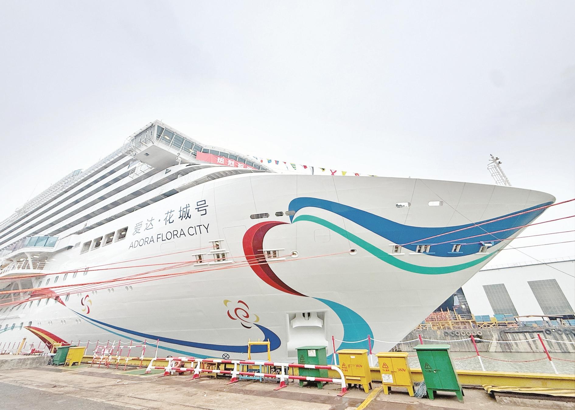 这是3月16日拍摄的第二艘国产大型邮轮“爱达·花城号”。我国第二艘国产大型邮轮“爱达·花城号”计划于3月20日在上海出坞。根据计划,“爱达·花城号”邮轮将于今年5月底出海试航,预计年底前正式交付。“爱达·花城号”邮轮总吨位达到14.19万吨,与首艘国产大型邮轮“爱达·魔都号”相比,“爱达·花城号”邮轮在设计和建造上进行了诸多改进。 新华社记者 丁汀 摄