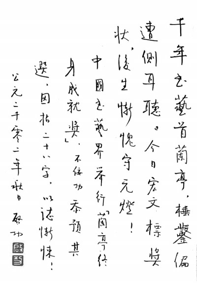 兰亭奖的举办,既是对当代书法水平与成就的阶段性检验与总结,也是对续写兰亭精神,引领当代书法创作、研究发展的有益助推。