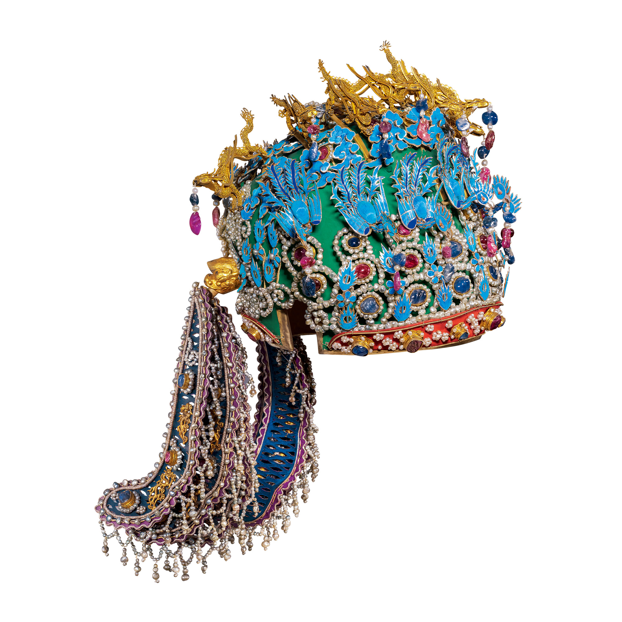 孝端皇后的这件凤冠,是用漆竹扎成帽胎,面料以丝帛制成,前部饰有九条金龙,口衔珠滴,下有八只点翠金凤,后部也有一金凤,共九龙九凤。金凤凤首朝下,口衔珠滴。珠滴可以在走动的时候,像步摇那样随步摇晃。翠凤下有3排以红蓝宝石为中心的珠宝钿,其间点缀着翠兰花叶,冠檐底部有翠口圈,上嵌宝石珠花,后侧下部左右各饰点翠地嵌金龙珠滴三博鬓,博鬓上嵌镂空金龙、珠花璎珞,似金龙奔腾在翠云之上,翠凤展翅翱翔于珠宝花丛之中,金翠交辉,富丽堂皇。此冠共嵌未经加工的天然红宝石百余粒,珍珠5000余颗,造型庄重,制作精美,采用的工艺有花丝、点翠、镶嵌、穿系等。