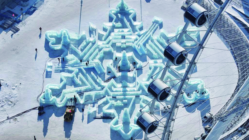 初冬时节,取自松花江的冰块,成为这里的“基石”。上万名冰建工人齐聚园区。他们中,有传承几代的冰雕大师,也有初露锋芒的年轻匠人。在设计图指引下,电锯飞转、冰屑飞溅,规格一致的冰块被雕琢成各式各样的形态。