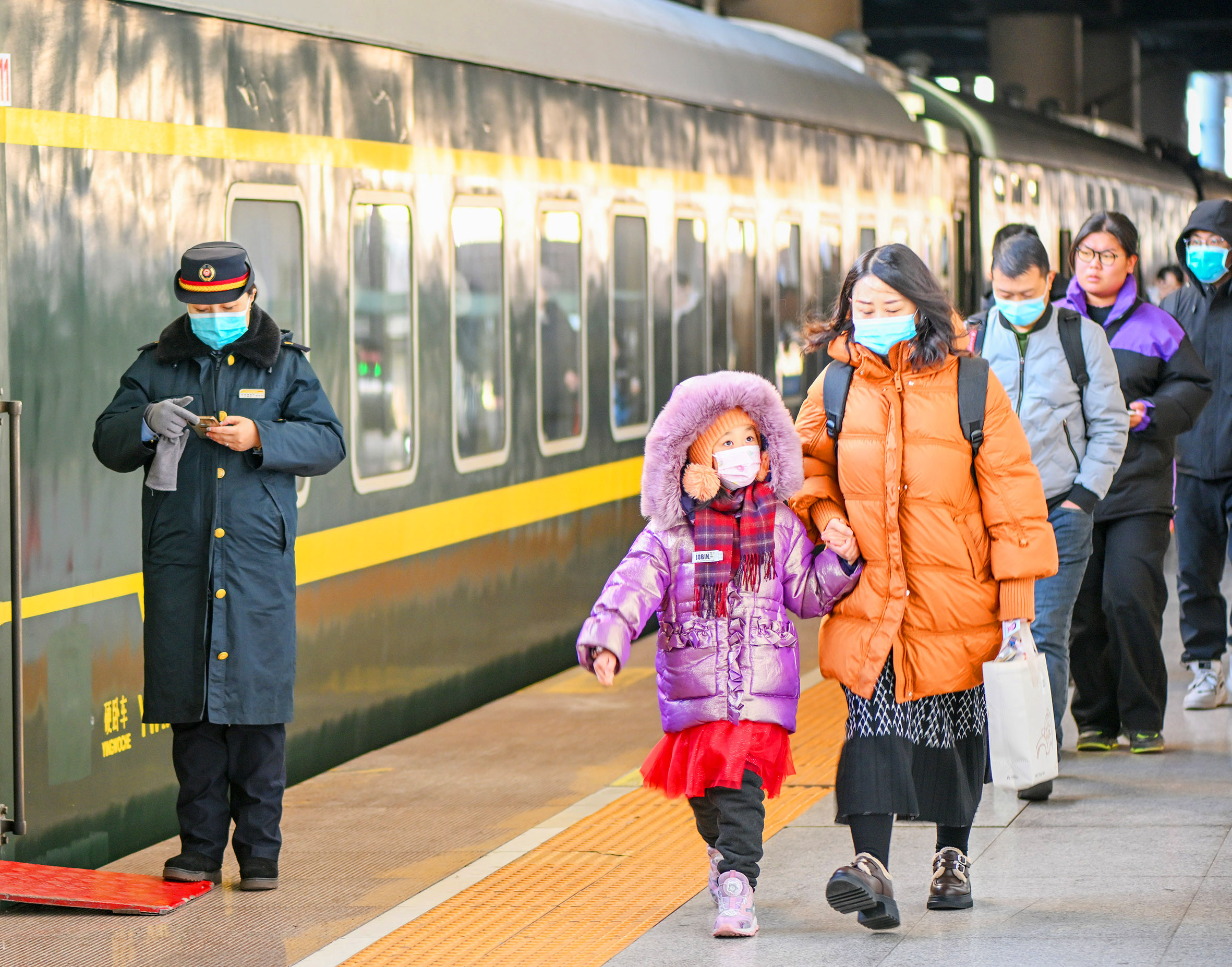 1月19日,乘客们在呼和浩特东站上车。 春运期间,运行在内蒙古草原深处的6856/7次列车座无虚席。这趟连接二连浩特与呼和浩特的列车全程491公里,票价53元,沿途经停28个车站,被广大农牧民亲切称为草原“慢火车”。 新华社记者 连振 摄