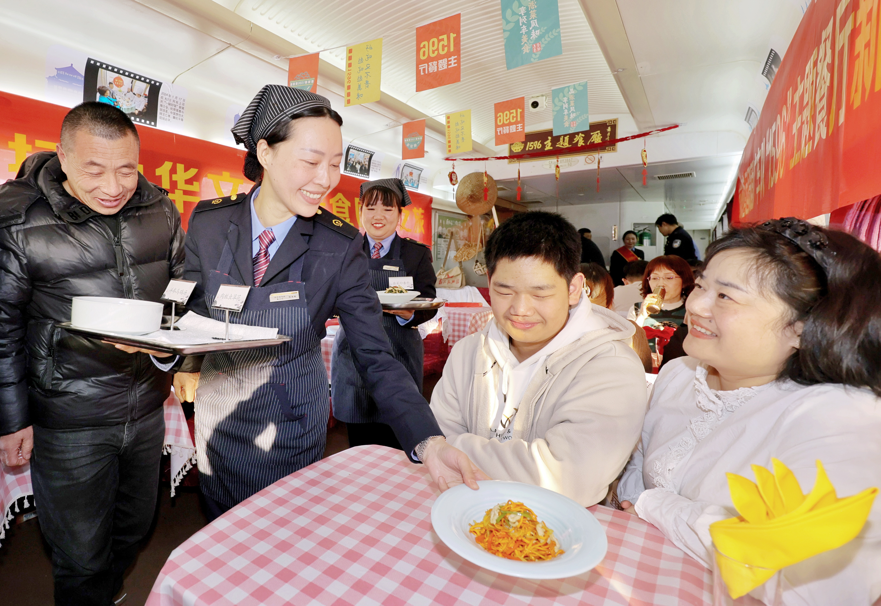 1月13日,铁路杭州客运段甬广车队餐车长程淑敏(左二)在K212次列车上邀请乘客品尝新品菜肴。 在列车餐车上吃一顿热气腾腾、香气四溢的餐食,是许多乘客关于旅途的美好记忆。今年春运期间,铁路杭州客运段将列车上的“一碗好饭”作为提高客运服务质量、提升旅客出行体验的重点环节。该段下属的甬广车队K212/209、K210/211次列车组织餐车厨师交流学习,更新餐车菜单、推出多种新品菜肴,并在普速列车上也实行远程点餐、送餐到座的服务,用饱含烟火气的“一碗好饭”温暖旅客的春运归途。 新华社记者 江汉 摄