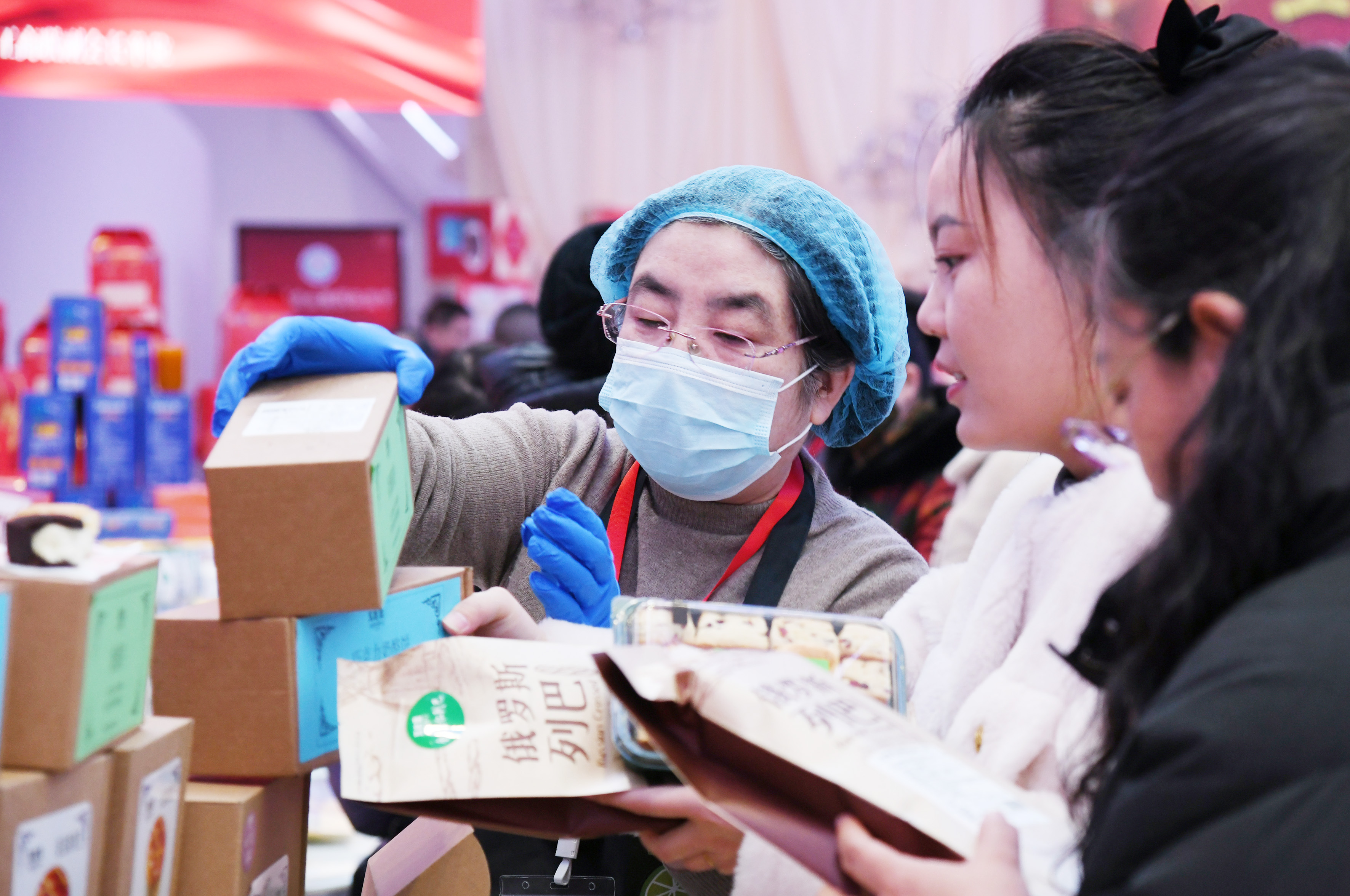 红毯铺地、灯笼高挂,熙熙攘攘的人群中,商家的吆喝声此起彼伏。展位上,散发着诱人香气的熟食礼盒、各式各样的坚果奶食、丰富多样的非遗制品……品类齐全的年货商品整齐摆放。展位前,挤满了购买年货的顾客,大家走走停停、挑挑拣拣,认真挑选着心仪的产品,感受着家门口浓浓的“年味”。