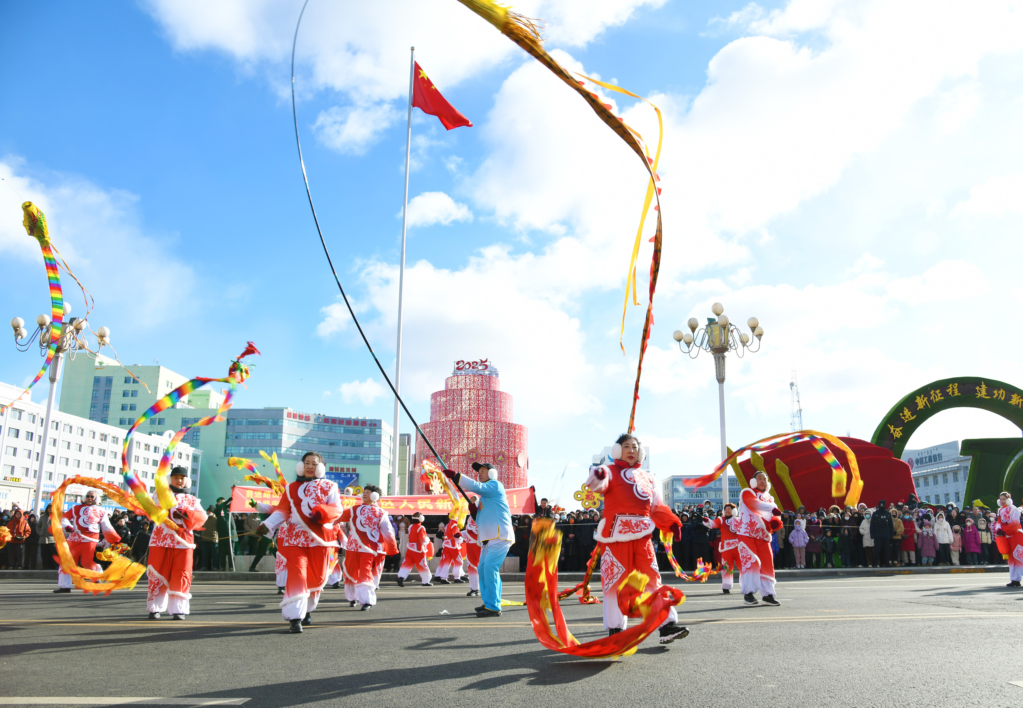 除了欢腾飞舞的彩龙,旋转抖动的彩扇、风趣诙谐的旱船、热烈欢腾的腰鼓、惊险刺激的踩高跷、喜庆十足的传统秧歌……众多丰富多元且极具特色的节目轮番上演,令人目不暇接。众多市民游客拍照打卡,记录下这一难忘时刻。