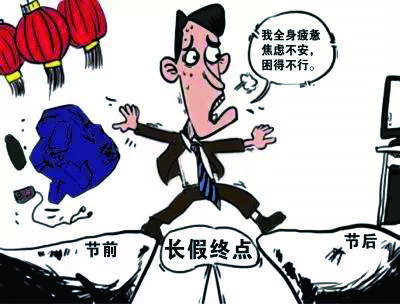 头痛眼涩、腰酸背痛、无精打采、反应迟钝,感觉浑身不舒服,在假日里比工作时还累,这是疲劳综合征。春节期间,亲戚朋友聚会不断,美味佳肴琳琅满目、各种小吃应接不暇,鸡鸭鱼肉等油腻食物摄入过多,会造成肠胃负担,从而导致腹痛、腹泻、消化不良等症状,这是消化系统紊乱。睡觉的时候头脑中老是浮现出假期中的欢乐场面,久久不能入睡;又或是想到眼下的工作而焦虑失眠。睡着一段时间后莫名其妙地突然醒来,想再入睡却没有睡意;反复早醒引起情绪低落、精神不振、空虚无聊等症状,这是睡眠紊乱。