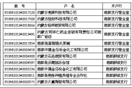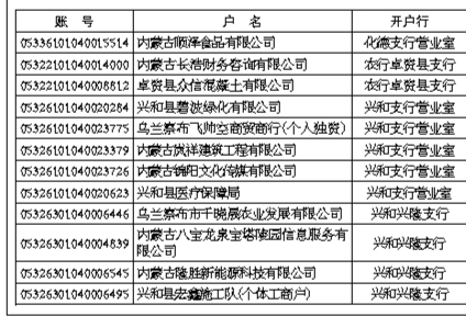 以下企业在我行开立的结算账户因长期未使用将进入长期不动管理,希望以下公司见报后一个月内到开户网点办理账户恢复,如不来办理我行将强制转入不动户,由此带来一切由开户企业承担。特此公告 中国农业银行股份有限公司乌兰察布分行