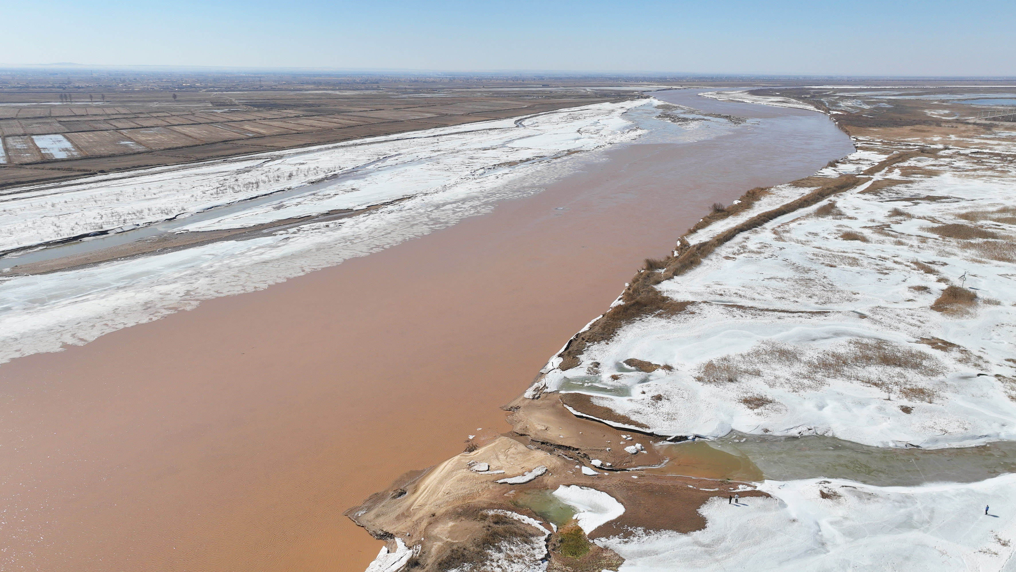 3月16日在内蒙古包头市拍摄的黄河(无人机照片)。 近日,随着气温回升,黄河内蒙古包头段已进入开河期。 新华社记者 贝赫 摄