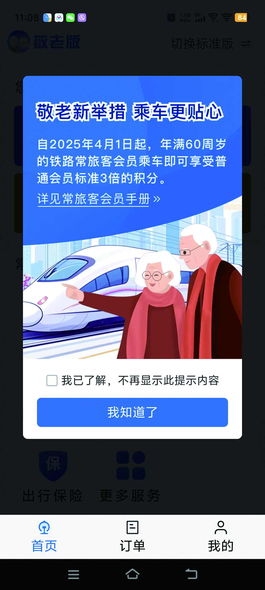 根据政策调整,60周岁及以上铁路常旅客会员乘坐旅客列车(旅游专列、国际列车除外)时,所获积分由原来的票面金额5倍提升至15倍,是普通常旅客会员积分累积比例的3倍。这意味着老年旅客每次购票出行后,可获得更高额度的积分用于兑换车票,有效降低出行成本。